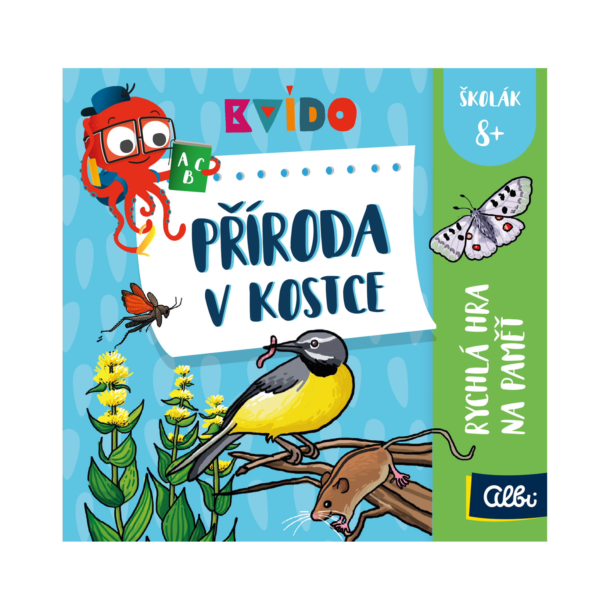 Hry Kvído V kostce navazují na oblíbené hry V kostce, ale tentokrát jsou propojeny s oblíbenou dětskou postavou chobotničky Kvída. Na každé ze 60 ilustrovaných karet jsou znázorněny informace z určité oblasti. Hráči mají patnáct vteřin, aby si toho z ní zapamatovali co nejvíce, a zvládli odpovědět na jednu až dvě vylosované otázky. Pokud si na hrací kostce hodí obrázek Kvída, nastává kolo s bonusovou Kvídovou paměťovou hrou. Tu hrají všichni hráči zároveň – snaží se pokrýt svoji kartu správnými žetony podle toho, jak si zapamatovali předlohu. Kvído V kostce obsahuje: 60 karet s obrázky i otázkami k danému tématu, 20 oboustranných bonusových karet pro Kvídovu paměťovku, 4 bodovací karty, 32 obrázkových žetonů pro bonusový úkol, 40 bodovacích žetonů, 1 přesýpací hodiny na 15 sekund a 1 Kvídovu hrací kostku.