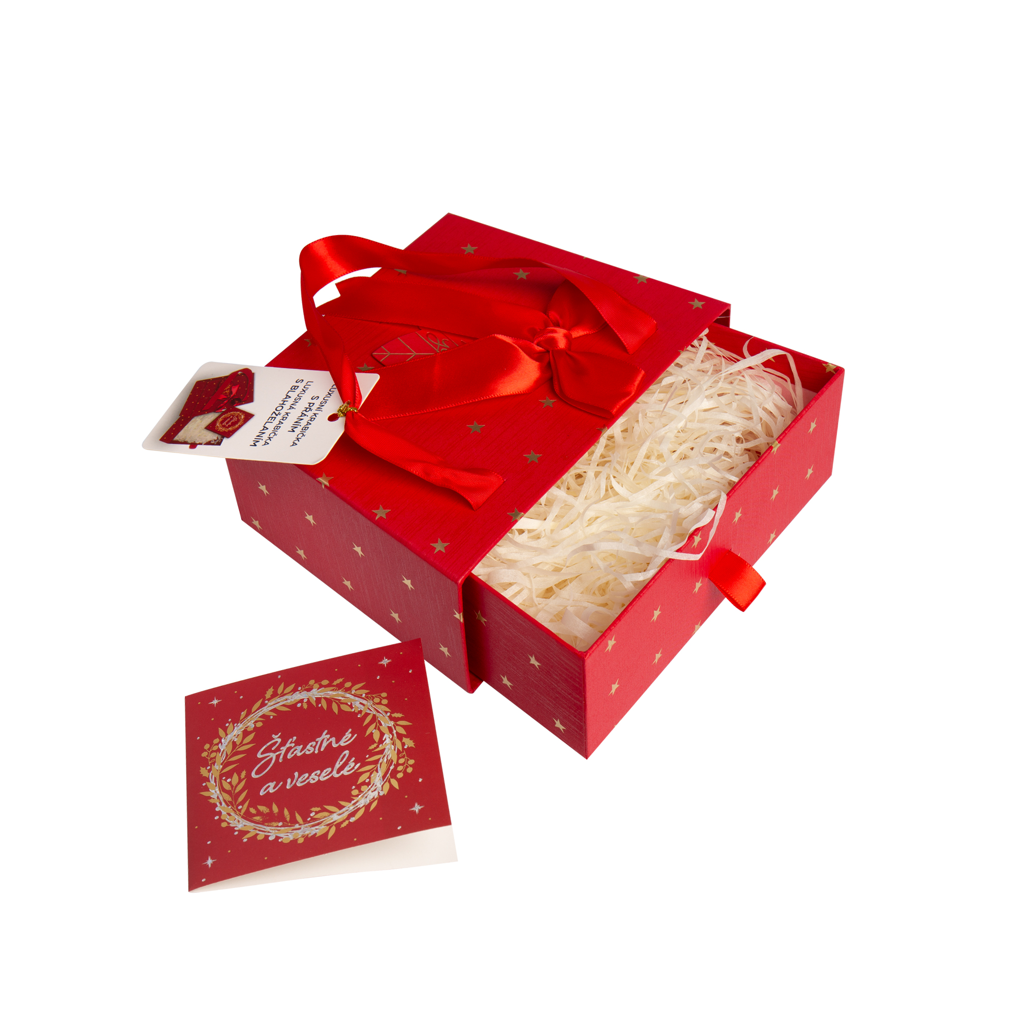 Máte koupený vánoční dárek a chcete milovanou osobu ohromit i jeho luxusním balením? Jednoduché a přitom efektivní řešení nabízí luxusní dárková krabička od Albi. Stačí předmět uložit do "šuplíčku" s papírovou výstelkou, napsat vzkaz do přiloženého přáníčka s motivem vánočního věnce a máte zabaleno. Svatební dárková krabice má navíc krásnou ozdobnou mašli a dlouhé úchytky ze stuhy, takže ji lze předat jako dárkovou tašku. Tato luxusní červená krabice se zlatou ražbou je dostupná ve třech velikostech. Rozměry malé krabice: 13 × 9 × 5 cm (šířka × hloubka × výška) Rozměry střední krabice: 18 × 13 × 6,5 cm (šířka × hloubka × výška) Rozměry velké krabice: 24,5 × 20,5 × 10 cm (šířka × hloubka × výška) Krabičku dodáváme složenou.
