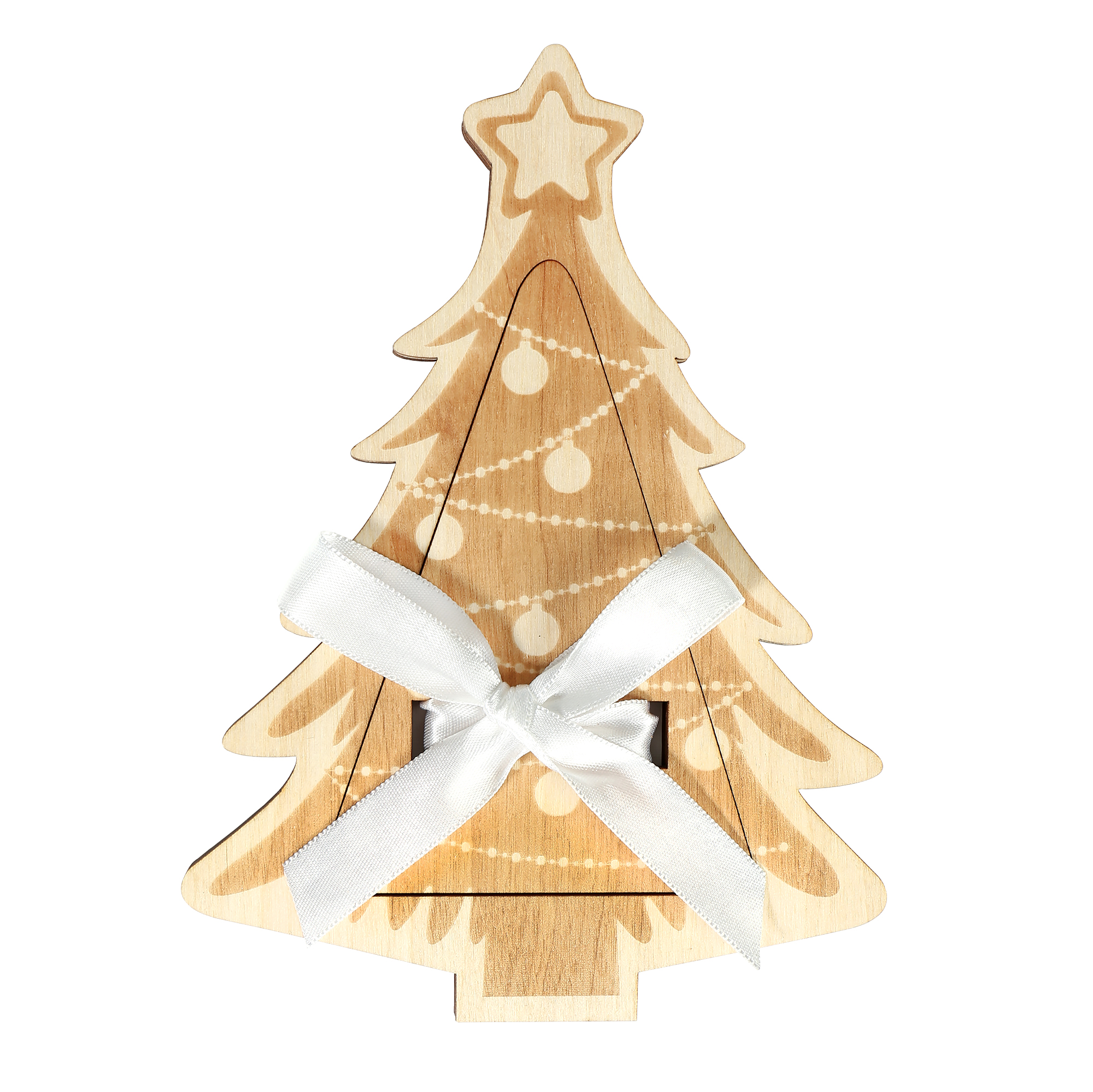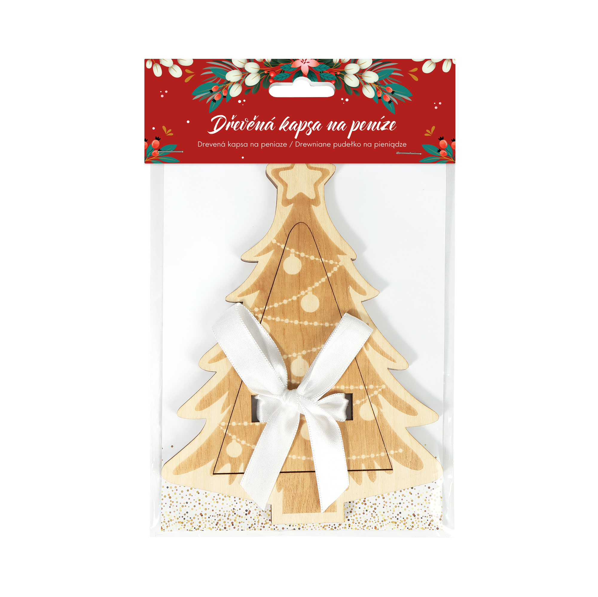 Chystáte se darovat peníze a přemýšlíte o originálním způsobu zabalení? Zvolte roztomilý vánoční stromeček s mašlí! Malá dárková kapsa na peníze ze dřeva umožňuje darovat bankovky či dárkové poukazy originálním způsobem, který potěší rodinu i přátele v období Vánoc. Rozměry: cca 13,2 cm × 18 cm × 0,6 cm Dřevěné kapsy na peníze jsou vyráběny ručně v České republice.