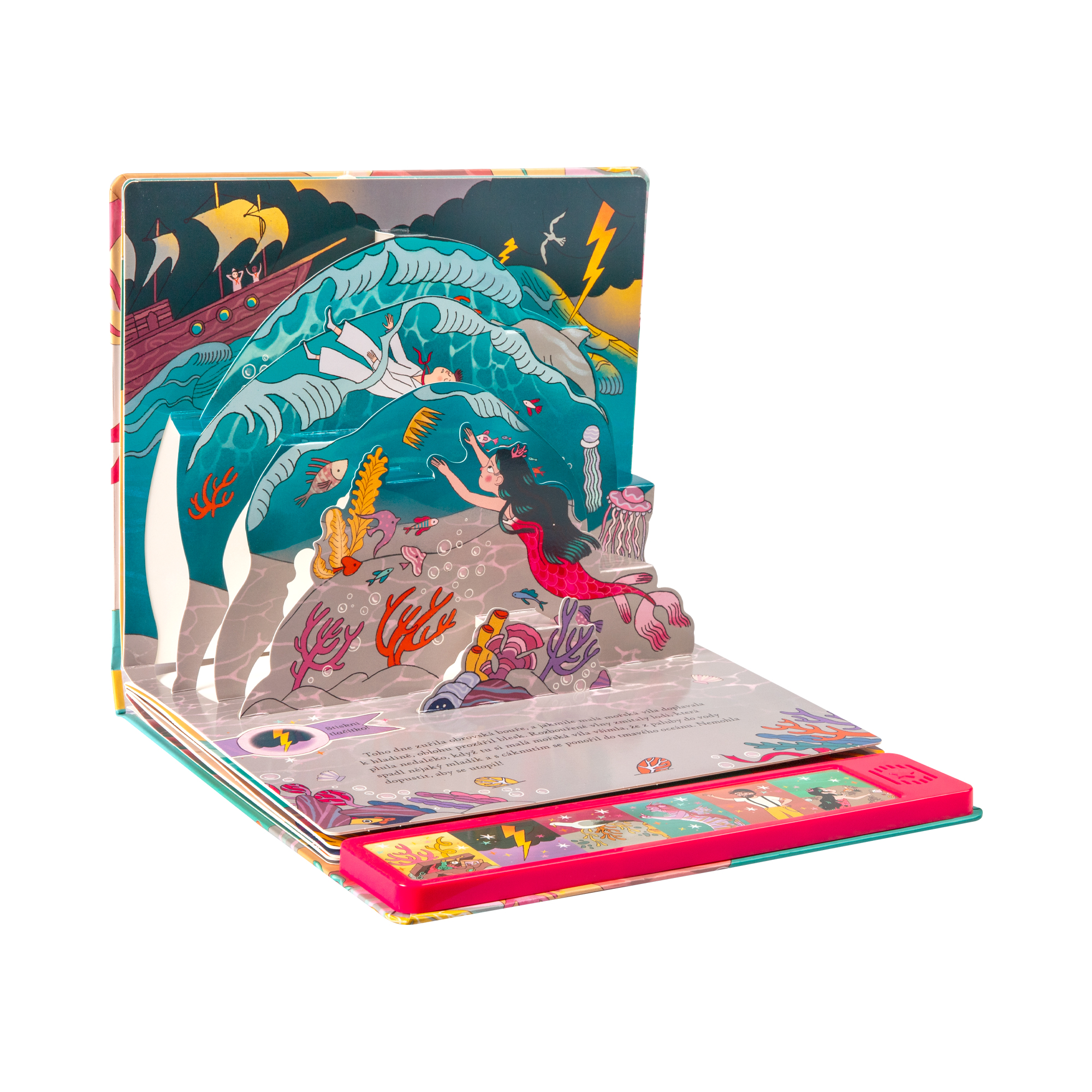 Malá mořská víla sní o tom, že vstoupí na pevninu a setká se s člověkem. Když jí mořská čarodějka nabídne příležitost opustit oceán, bez zaváhání ji přijme, ale může svůj podmořský domov opustit navždy? Oživte klasický příběh o Malé mořské víle díky tomuto okouzlujícímu prostorovému leporelu. Ve spodní části dětské knihy najdete barevný zvukový panel se 6 ikonami. Na každé stránce je vyobrazená odpovídající ikona, kterou stačí zmáčknout, a pohádkový příběh rázem ožije. Každá z 6 stran je navíc doplněna úchvatným 3D pop-up efektem, díky němuž postavy a scény doslova vystupují z knihy a vtáhnou děti přímo do děje. Vyměnitelné knoflíkové baterie (3 × 1,5V AG10/LR1130) jsou součástí balení. Počet stran: 6 Rozměry knihy: 27 × 26 cm Autor: Leanne Felton Ilustrace: Sara Brienza ISBN: 978-80-7688-298-0