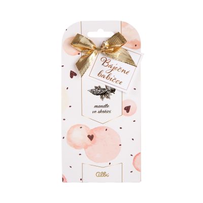 Udělejte radost svým blízkým lahodnými mandlemi v mléčné čokoládě obalené ve voňavé skořici. Tento sladký dárek v pěkném balení s věnováním je milou pozorností, kterou potěšíte každého. Hmotnost: 120 g Rozměry balení: 19,3 cm × 9 cm × 4, 8 cm Mandle ve skořici 120g Složení: Mléčná čokoláda 79% (cukr, kakaové máslo, sušené mléko, sušená syrovátka, kakaová hmota, emulgátor sójový lecitin, aroma (vanilín), mandle jádra pražená 20%, skořice mletá 1%. Alergeny: Výrobek obsahuje sóju, mléko a jiné ořechy. Výrobek může obsahovat arašídy a sezam. Výživové údaje na 100 g: energetická hodnota 2376 kJ/572 kcal tuky 38,1 g – z toho nasycené mastné kyseliny 16,5 g sacharidy 45,9 g – z toho cukry 42,4 g bílkoviny 9,3 g sůl 0,17 g Hmotnost: 120 g Skladujte v suchu, chraňte před teplem.