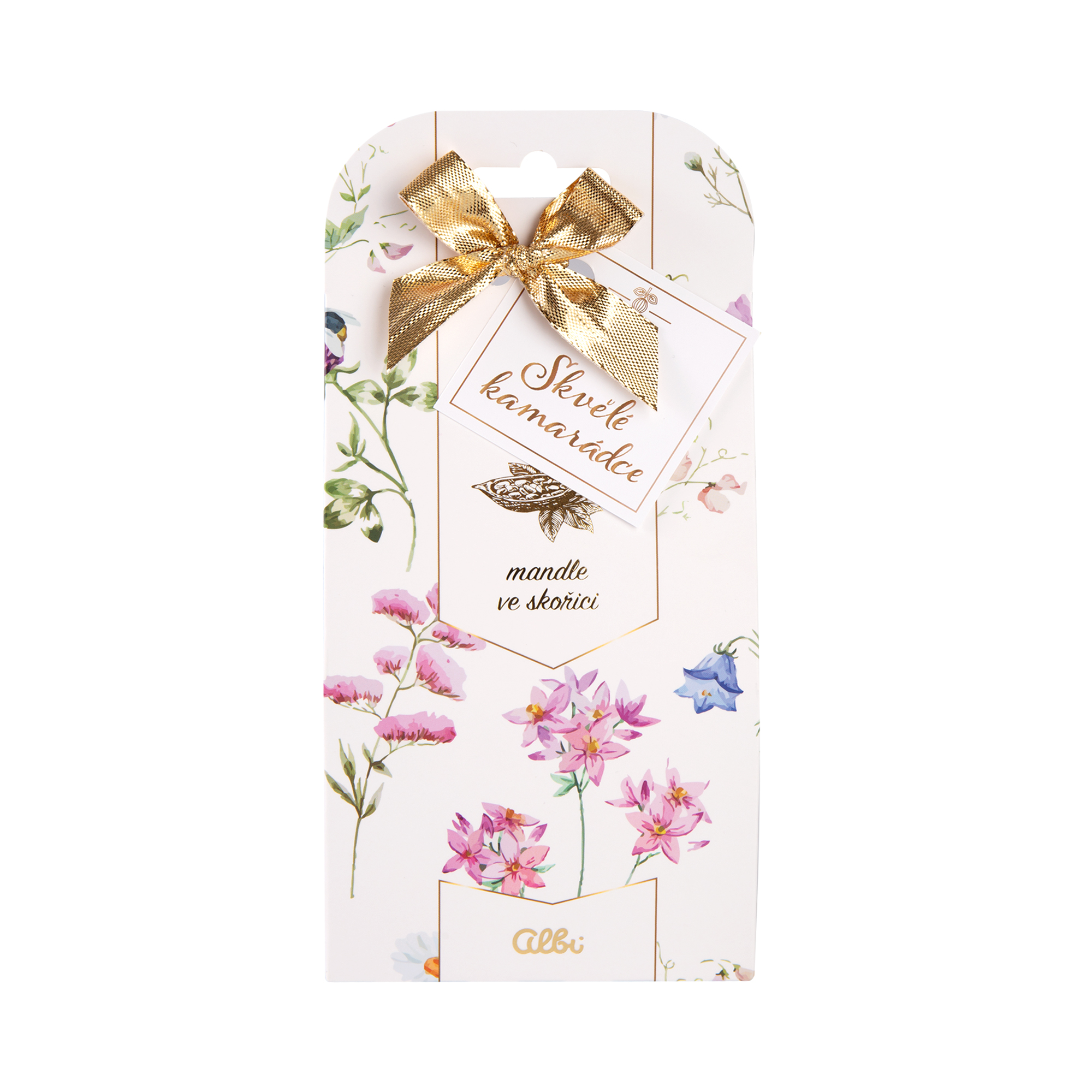 Udělejte radost svým blízkým lahodnými mandlemi v mléčné čokoládě obalené ve voňavé skořici. Tento sladký dárek v pěkném balení s věnováním je milou pozorností, kterou potěšíte každého. Hmotnost: 120 g Rozměry balení: 19,3 cm × 9 cm × 4, 8 cm Mandle ve skořici 120g Složení: Mléčná čokoláda 79% (cukr, kakaové máslo, sušené mléko, sušená syrovátka, kakaová hmota, emulgátor sójový lecitin, aroma (vanilín), mandle jádra pražená 20%, skořice mletá 1%. Alergeny: Výrobek obsahuje sóju, mléko a jiné ořechy. Výrobek může obsahovat arašídy a sezam. Výživové údaje na 100 g: energetická hodnota 2376 kJ/572 kcal tuky 38,1 g – z toho nasycené mastné kyseliny 16,5 g sacharidy 45,9 g – z toho cukry 42,4 g bílkoviny 9,3 g sůl 0,17 g Hmotnost: 120 g Skladujte v suchu, chraňte před teplem.