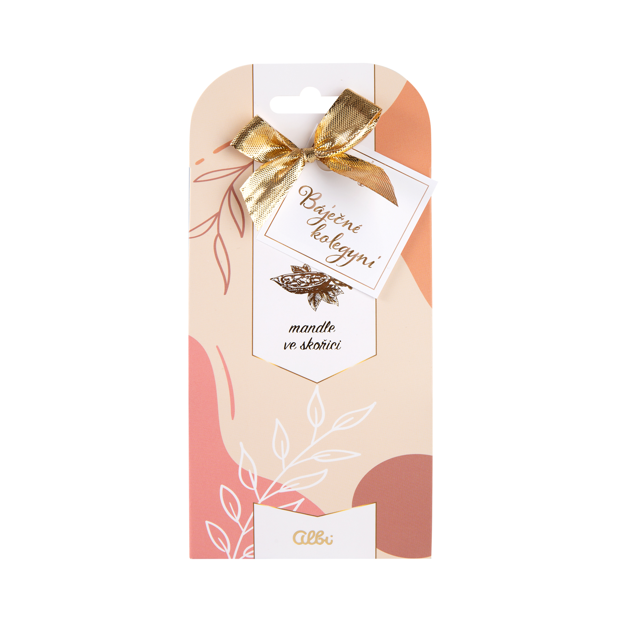 Udělejte radost svým blízkým lahodnými mandlemi v mléčné čokoládě obalené ve voňavé skořici. Tento sladký dárek v pěkném balení s věnováním je milou pozorností, kterou potěšíte každého. Hmotnost: 120 g Rozměry balení: 19,3 cm × 9 cm × 4, 8 cm Mandle ve skořici 120g Složení: Mléčná čokoláda 79% (cukr, kakaové máslo, sušené mléko, sušená syrovátka, kakaová hmota, emulgátor sójový lecitin, aroma (vanilín), mandle jádra pražená 20%, skořice mletá 1%. Alergeny: Výrobek obsahuje sóju, mléko a jiné ořechy. Výrobek může obsahovat arašídy a sezam. Výživové údaje na 100 g: energetická hodnota 2376 kJ/572 kcal tuky 38,1 g – z toho nasycené mastné kyseliny 16,5 g sacharidy 45,9 g – z toho cukry 42,4 g bílkoviny 9,3 g sůl 0,17 g Hmotnost: 120 g Skladujte v suchu, chraňte před teplem.