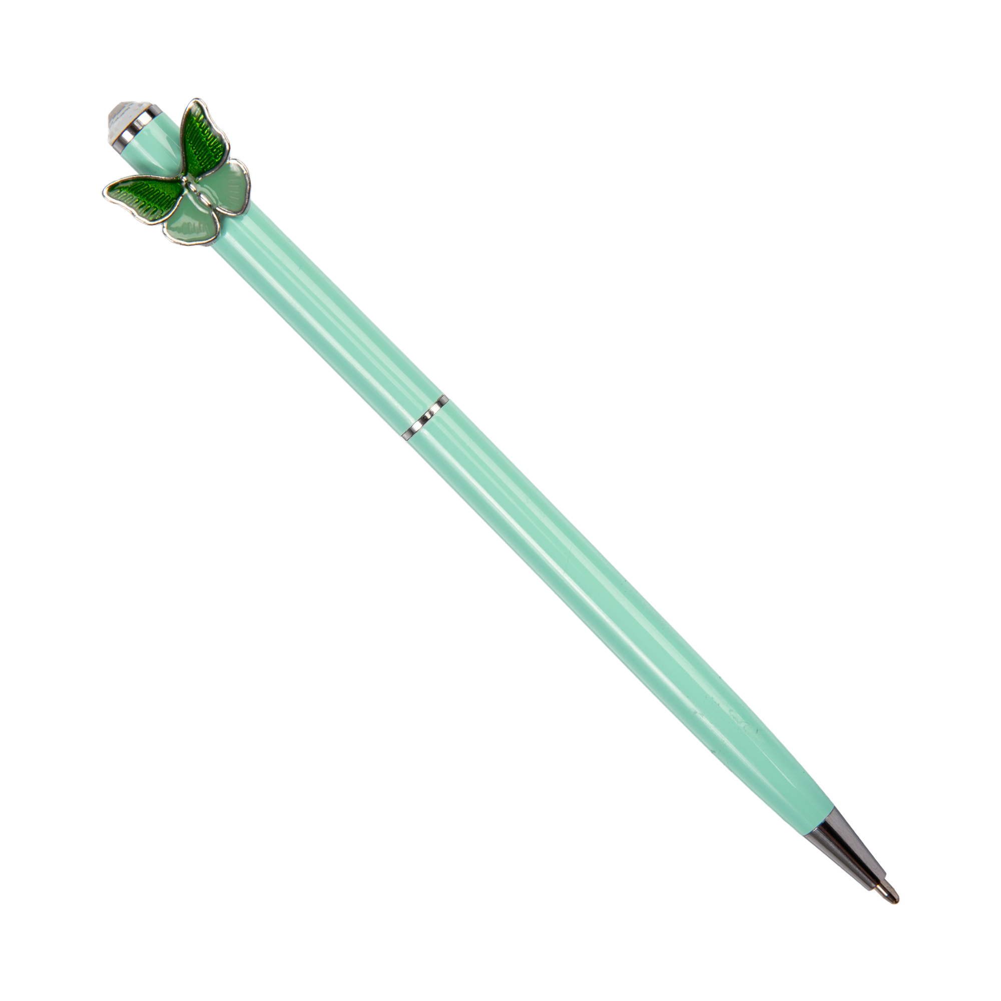 Elegantní mentolová propiska je zdobená jemným motýlkem a třpytivým kamínkem na vršku, který jí dodává nádech luxusu. Propiska se pak otevírá praktickým otočením spodní části a dobře padne do ruky – ideální do práce i do školy. Barva inkoustu: modrá