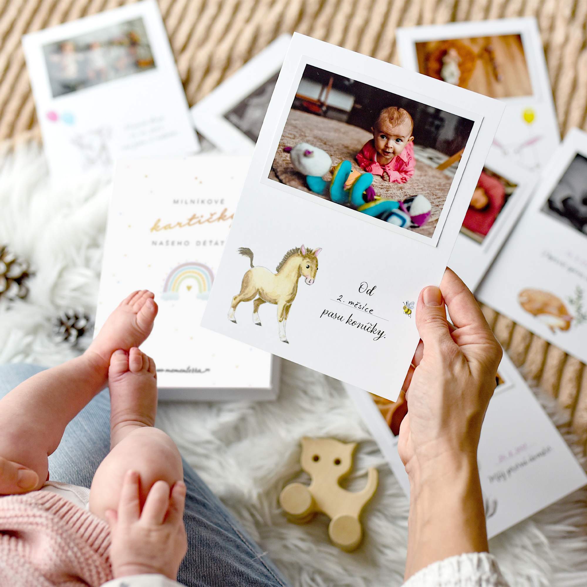 Zaznamenejte si zásadní okamžiky mateřství. Od první fotky na ultrazvuku až po první krůčky a slova vašeho miláčka. Milníkové kartičky pro miminko jsou nápaditou připomínkou všech velkých událostí jeho ale i vašeho života. V krabičce najdete 32 kartiček velikosti A5 zaznamenávajících jednotlivé události s prostorem pro nalepení fotografie z daného momentu i zapsání data. Z vyplněných kartiček si tak vytvoříte originální album nejdůležitějších okamžiků. Kartičky jsou vyrobené z tvrdého bílého papíru, na který lze psát tužkou, propiskou i perem. Prostor pro fotku je dostatečně velký na to, aby se do něj vešel polaroidový snímek i klasická fotografie na výšku či šířku. Celkový minimalistický design pak vyvažují hravé ručně malované ilustrace speciálně vytvořené pro každý milník. karty jsme nechali zabalit do něžné, a přitom hravé krabičky se zlatou ražbou. Milníkové kartičky se tak stávají krásným dárkem pro nastávající maminky a vyplněné zase poslouží jako nápadité a zároveň velmi osobní poděkování prarodičům. Sada Milníkové kartičky našeho děťátka obsahuje: 12 kartiček 1. – 11. měsíc a 1. narozeniny, 15 kartiček pokroků a zážitků, 5 univerzálních kartiček s možností vepsání si milníků, které jsou důležité právě pro vás a luxusní krabičku.