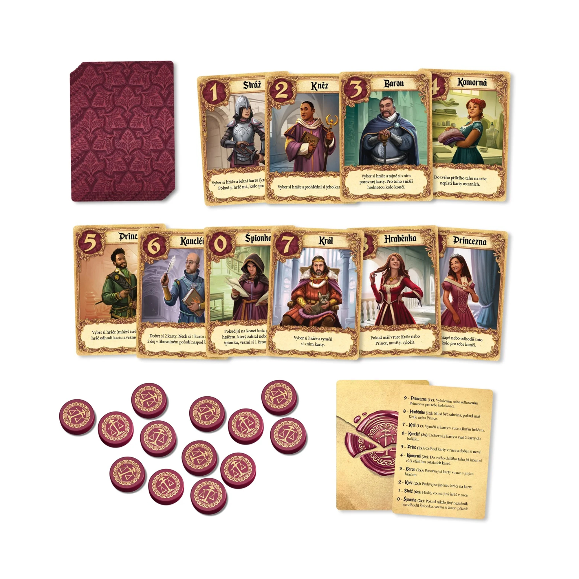 Přechytračte své soupeře a buďte první, komu se podaří doručit milostný dopis půvabné princezně! Ve hře Milostný dopis se proti sobě postaví 2 až 6 nápadníků, kteří se snaží dostat své psaní přímo do rukou princezny, jež touží najít ideálního muže, s nímž by mohla usednout na trůn. Každý hráč začíná kolo s jednou kartou. Na začátku tahu si dobere další kartu z balíčku, vybere si jednu ze svých dvou karet a tu zahraje – přičemž se ihned vyhodnotí její efekt. Některé karty mohou hráče ze hry vyřadit: třeba když se konkurenční nápadník postará o to, aby váš dopis nedorazil. Tato rozšířená verze Milostného dopisu nabízí i možnost zahrát si původní „klasickou“ variantu pro 2–4 hráče. Stačí na začátku hry z balíčku vyřadit 5 konkrétních karet (jejich seznam naleznete v pravidlech). Oproti klasické verzi tato edice navíc obsahuje více karet, bodovací žetony a praktický látkový pytlík pro uložení hry. Hra Milostný dopis (Eko box) obsahuje: 21 karet s postavami, 6 přehledových karet, 13 žetonů přízně, 1 látkový pytlík, česká pravidla
