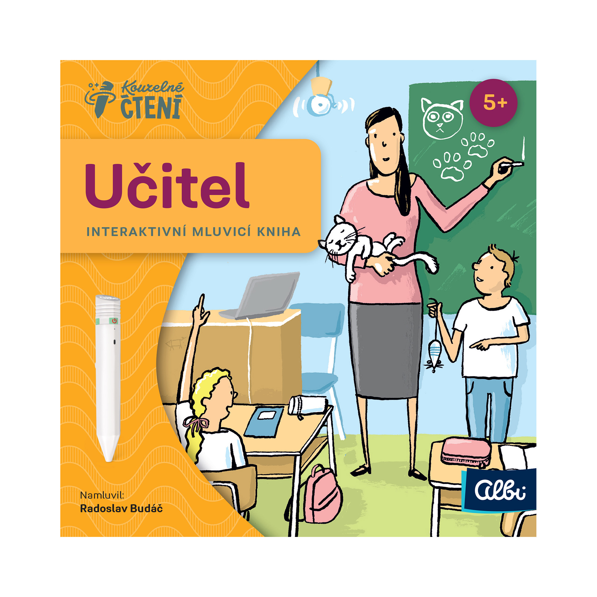 Interaktivní mluvící mini kniha Učitel seznámí děti od 5 let s povoláním učitele. S Elektronickou Albi tužkou se podívají nejen do třídy a do kabinetu, ale i na lyže nebo na výlet do historie. V knize na ně čeká přes 500 zvuků a textů. Nechybí jednoduchý kvíz, který procvičí získané znalosti.   ZVUKOVÉ UKÁZKY Poslechněte si několik ukázek z miniknihy Učitel – Kouzelné čtení.             UPOZORNĚNÍ – NEFUNGUJE SAMOSTATNĚ BEZ ALBI TUŽKY! Interaktivní mluvící produkty (knihy, hry, puzzle, samolepky atd.) z edice Kouzelné čtení nefungují samostatně – k plné funkčnosti je potřeba elektronická Albi tužka. Albi tužka není součástí produktu – je nutné ji zakoupit zvlášť v sekci Kouzelné čtení – sady s tužkou.
