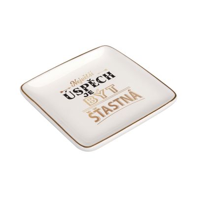 Mističky s milými texty a věnováními jsou ideální na drobné předměty, které potřebujete mít pohromadě. Mističky na drobnosti můžete využít třeba na klíče, mince, šperky, gumičky a sponky do vlasů či odličovací tamponky. Mističky lze využít i v kuchyni, např. na čajový sáček nebo koření. Díky vkusnému designu se zlatými okraji si mističku můžete také vystavit jako stylovou dekoraci. Nemyjte v myčce nádobí ani abrazivními prostředky. Rozměry: 8,5 cm × 8,5 cm Hloubka: 1,5 cm Materiál: keramika