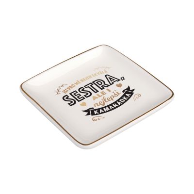 Mističky s milými texty a věnováními jsou ideální na drobné předměty, které potřebujete mít pohromadě. Mističky na drobnosti můžete využít třeba na klíče, mince, šperky, gumičky a sponky do vlasů či odličovací tamponky. Mističky lze využít i v kuchyni, např. na čajový sáček nebo koření. Díky vkusnému designu se zlatými okraji si mističku můžete také vystavit jako stylovou dekoraci.  Nemyjte v myčce nádobí ani abrazivními prostředky. Rozměry: 8,5 cm × 8,5 cm Hloubka: 1,5 cm Materiál: keramika