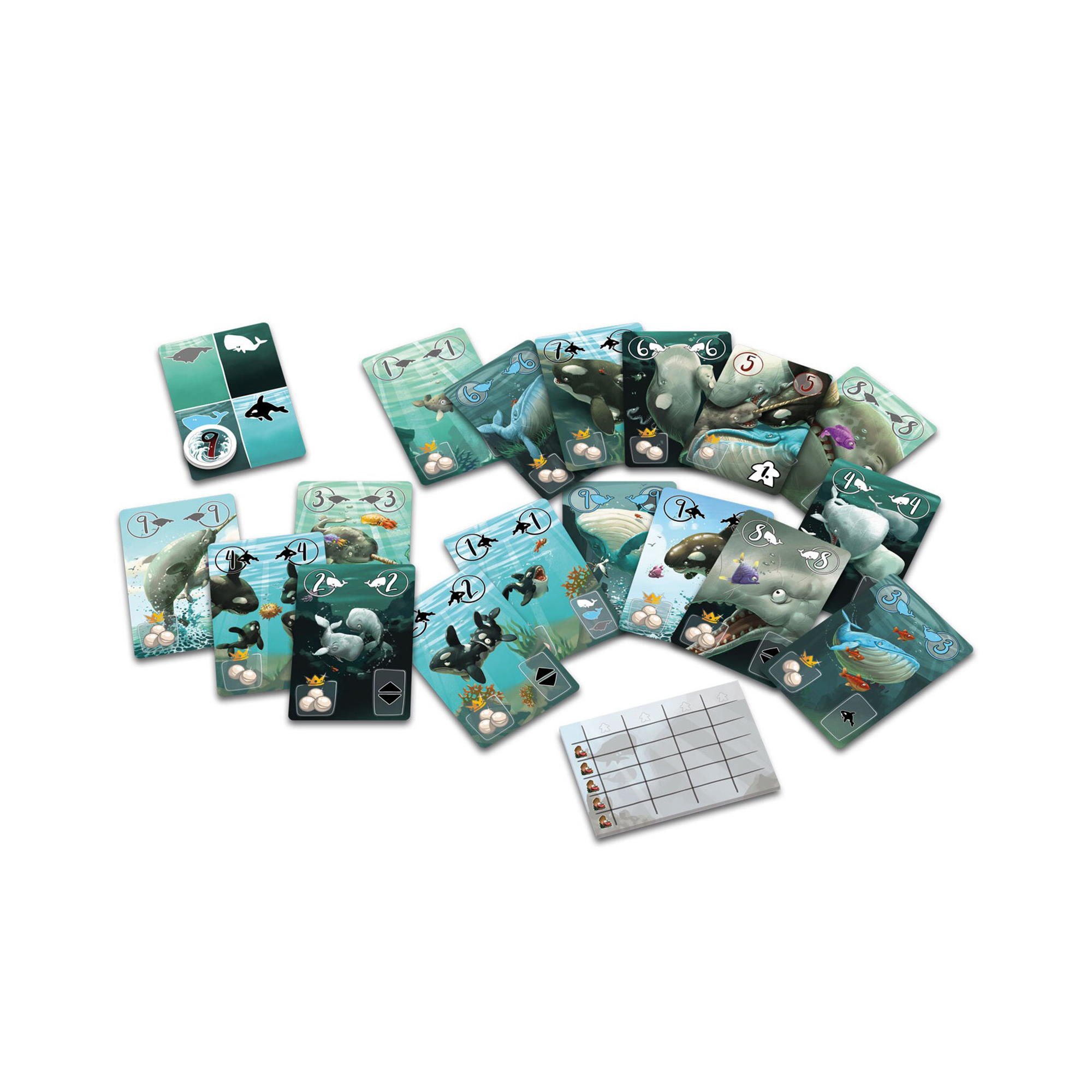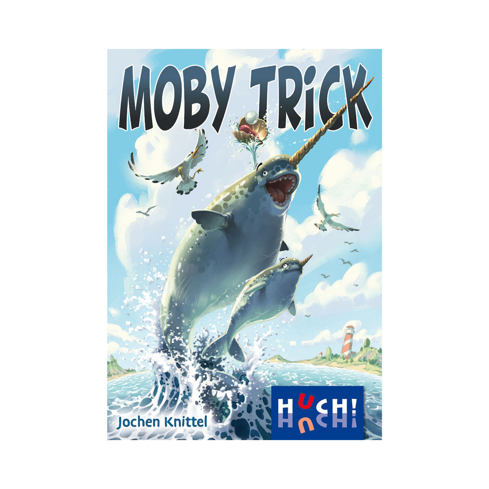 Narwhals are the trump cards in Moby Trick — but not always, because orcas, sperm whales, and blue whales can also turn the tide. All familiar trick-taking rules apply, but with a special twist: the player who wins the trick chooses one of the played cards to score. However, the player who originally played that card receives a bonus effect for a future round. For example, they might change the trump suit or otherwise influence the course of the game. Moby Trick contents: 37 cards, 1 wooden token, 1 result block, 1 game rule.