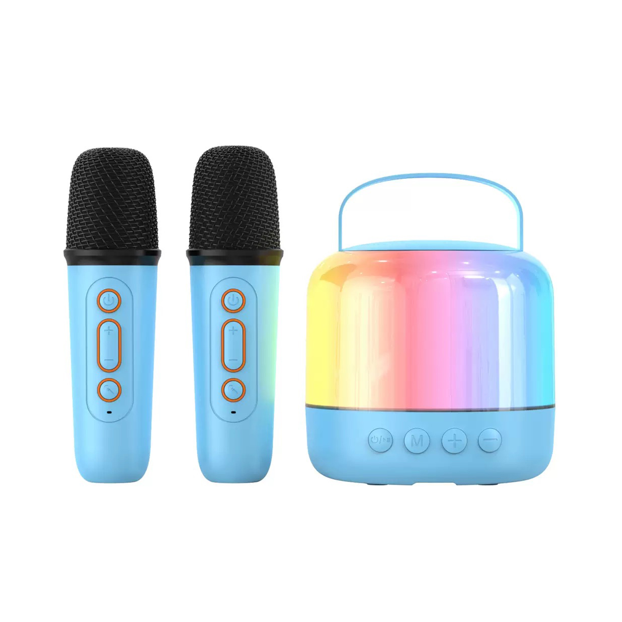 Rozjeďte pořádnou domácí párty s bezdrátovým karaoke setem se 2 mikrofony! Tento hravý a snadno ovladatelný set potěší všechny malé zpěváky a zpěvačky. Modrý karaoke set se skládá z reproduktoru s vestavěnou baterií a 2 bezdrátových mikrofonů. Připojte telefon, tablet nebo flash disk (přes Bluetooth, AUX nebo USB) a přehrávač automaticky spustí oblíbené písničky. Každý mikrofon má vlastní ovládací tlačítka pro hlasitost, ozvěnu i změnu režimu (lze přepínat mezi hlasem muže, ženy, dítěte a příšerky). Tlačítka umožňují samostatně regulovat intenzitu ozvěny (prostorového efektu), intenzitu výstupu z mikrofonu i hlasitost hudebního podkresu. Díky praktickému displeji a podsvícení je ovládání snadné i pro děti. Tento produkt má 5 typů světelných režimů: rotující barevné světlo, malé noční světlo, střídavé blikání barev, dynamický přechod barev a prolínání barev. Vestavěná baterie pak zajistí hodiny nepřerušované zábavy – nabíjení je možné přes běžný USB C kabel, který je součástí balení. Tento karaoke set podporuje dětskou kreativitu, rozvíjí řeč, rytmus a sebevědomí. Je ideální na narozeninové oslavy, rodinné večery nebo pod vánoční stromeček. Parametry: Rozměry reproduktoru: 10,5 × 10,5 × 10 cm Materiál krytu: ABS plast Verze Bluetooth: Bluetooth 5.3 podpora TF karet: až do 32 GB Dosah příjmu Bluetooth: do 10 metrů Výkon reproduktoru: 5 W Frekvenční rozsah: 50 Hz – 18 kHz Vstupní rozhraní: Type-C, AUX, USB, TF karta Nabíjecí napětí: 5 V / 1 A