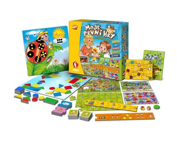 Hrajte si s dětmi nebo je nechte, ať si hrají, poznávají a objevují samy. S komplexním souborem her zlepší jemnou motoriku, paměť i postřeh, poznají abecedu i základní číslovky. Procvičí tvary, základní barvy a seznámí se se základy logiky. Jednotlivé prvky se provazují a vytvářejí další hry a jejich varianty. Hra obsahuje: herní plán pro 2 hry (Slunéčko, Loto), 3 oboustranné puzzle (9, 20 a 40 dílků), pexeso (24 obrázků), barevné tvary (čtvrečky, obdélníčky, trojúhelníčky, kolečka), logické skládačky, 2 kostky (tečkovaná, barevná).