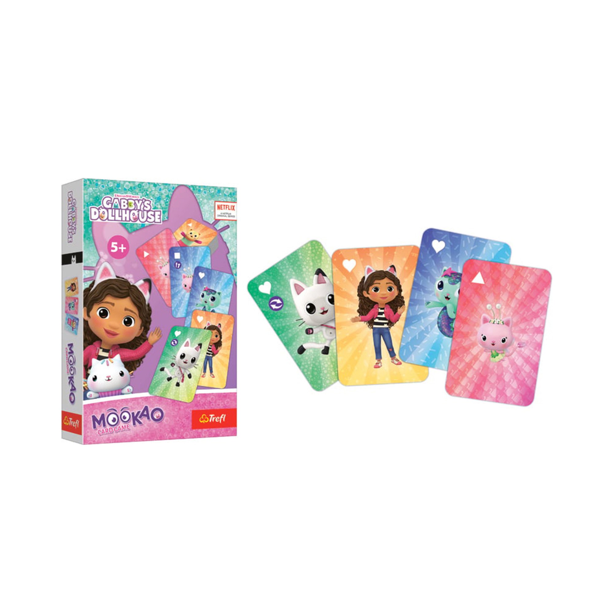 Mookao Gábinin kouzelný domek je dynamická a rychlá karetní hra, kde je vaším cílem co nejdříve se zbavit všech karet, které držíte v ruce. Základem hry je vykládání karet se stejným symbolem nebo barvou. Ale pozor! Cestu vám ztíží speciální karty s Gábi a jejími kočičími kamarády. Použijte je strategicky a zkomplikujte hru svým soupeřům! Tato hra s motivy Gabby's Dollhouse je ideální pro rozvoj postřehu, rychlosti a lehkého strategického myšlení – má jednoduchá pravidla a je vhodná pro děti od 5 let. Hra Mookao Gábinin kouzelný domek obsahuje: 80 karet a návod.
