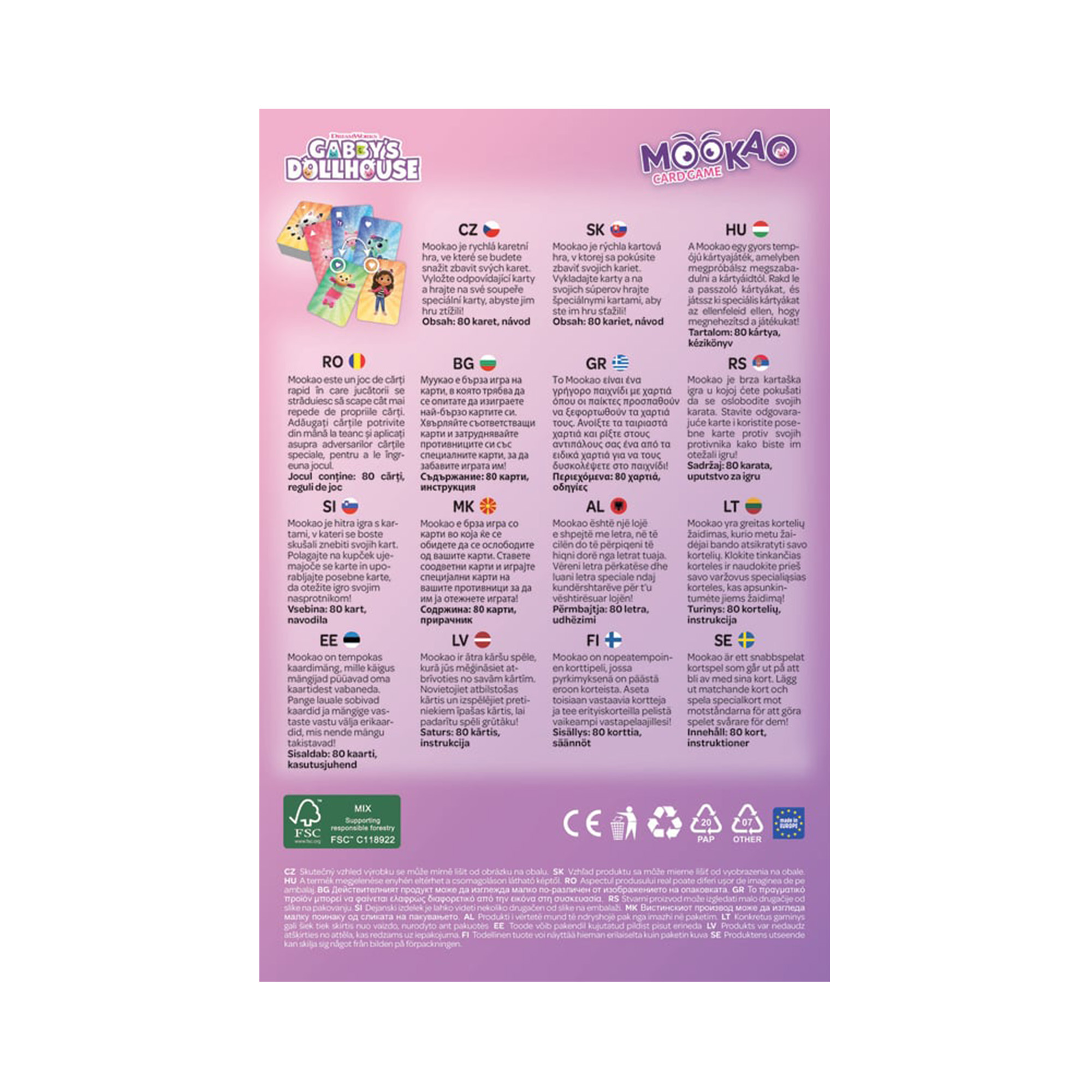 Mookao Gábinin kouzelný domek je dynamická a rychlá karetní hra, kde je vaším cílem co nejdříve se zbavit všech karet, které držíte v ruce. Základem hry je vykládání karet se stejným symbolem nebo barvou. Ale pozor! Cestu vám ztíží speciální karty s Gábi a jejími kočičími kamarády. Použijte je strategicky a zkomplikujte hru svým soupeřům! Tato hra s motivy Gabby's Dollhouse je ideální pro rozvoj postřehu, rychlosti a lehkého strategického myšlení – má jednoduchá pravidla a je vhodná pro děti od 5 let. Hra Mookao Gábinin kouzelný domek obsahuje: 80 karet a návod.