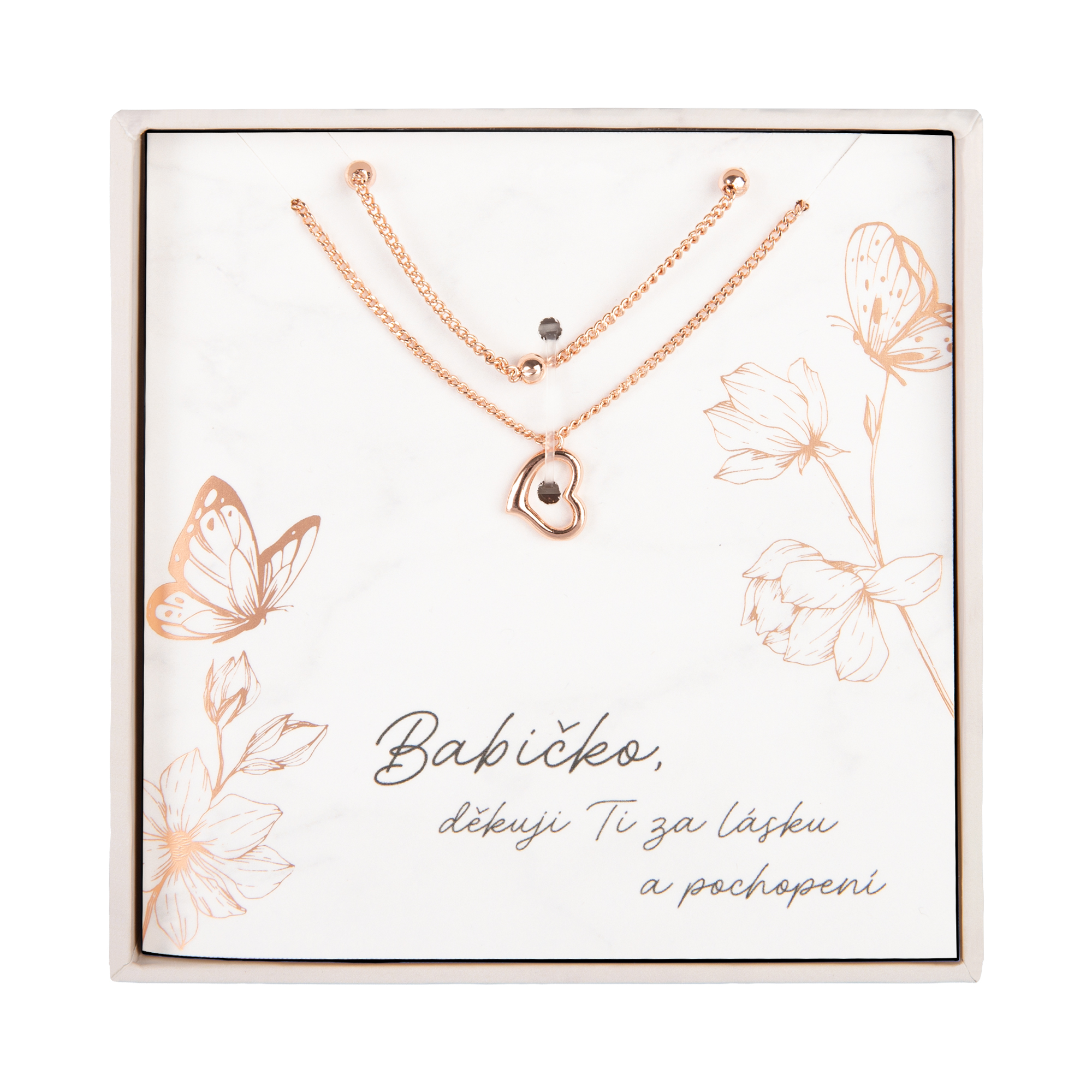 elegantní dvojité náhrdelníky v oblíbené barvě rose gold s osobním věnováním jsou krásným a smysluplným dárkem pro každou ženu. Jemné řetízky s minimalistickými přívěsky působí moderně a nadčasově. Náhrdelníky jsou uloženy v dárkové krabičce s osobním věnováním – vybírat můžete z různých variant pro maminku, babičku, sestru, kamarádku i další blízké.  Upozornění: aby vám šperk dlouho vydržel jako nový, zamezte jeho styku s vodou a chemikáliemi. Materiál: měď Povrchová úprava: pozlaceno 18karátovým zlatem Délka řetízků: 45 cm, 40 cm