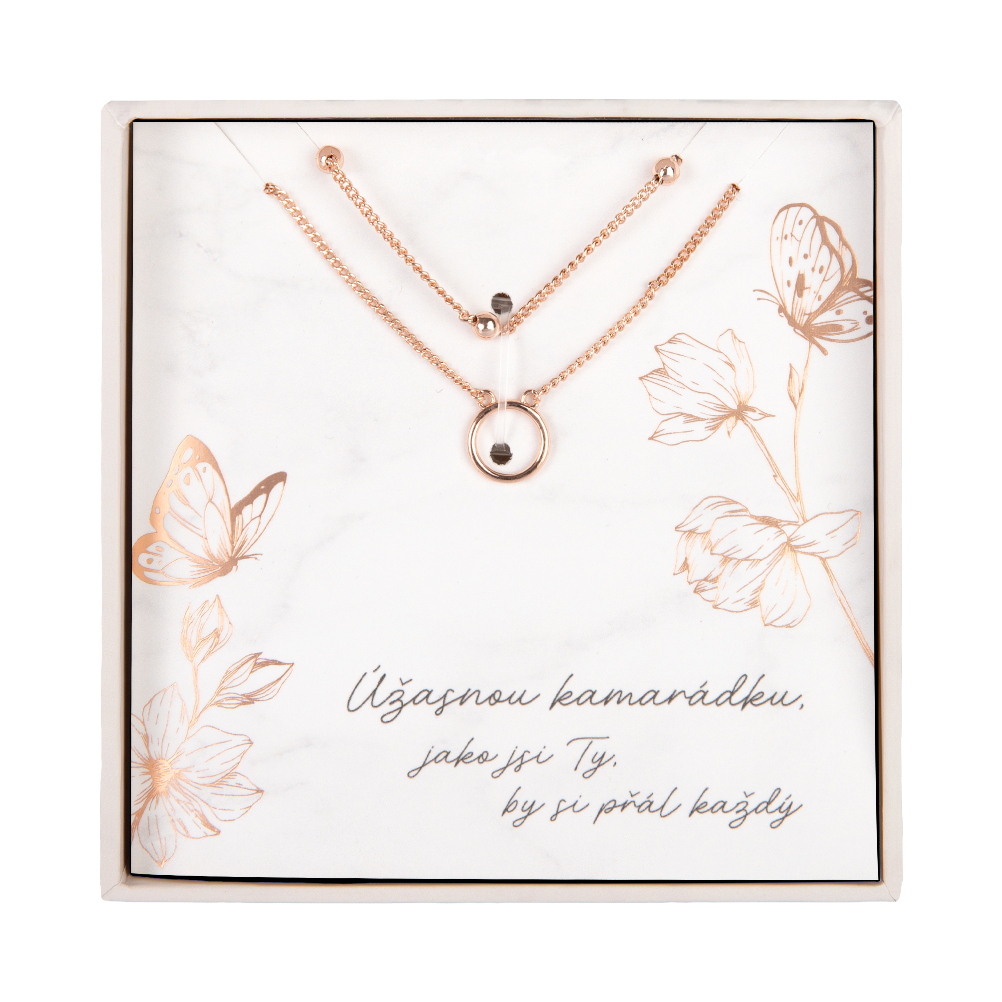 elegantní dvojité náhrdelníky v oblíbené barvě rose gold s osobním věnováním jsou krásným a smysluplným dárkem pro každou ženu. Jemné řetízky s minimalistickými přívěsky působí moderně a nadčasově. Náhrdelníky jsou uloženy v dárkové krabičce s osobním věnováním – vybírat můžete z různých variant pro maminku, babičku, sestru, kamarádku i další blízké. Upozornění: aby vám šperk dlouho vydržel jako nový, zamezte jeho styku s vodou a chemikáliemi. Materiál: měď Povrchová úprava: pozlaceno 18karátovým zlatem Délka řetízků: 45 cm, 40 cm