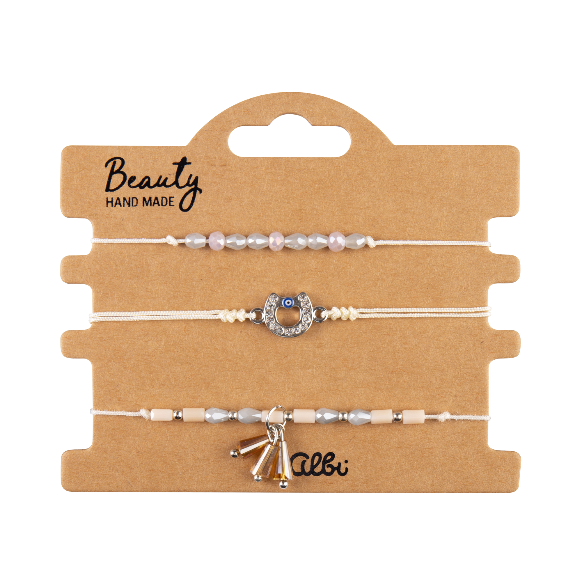 Sada 3 náramků uspokojí vaší touhu po parádění. Elegantní i vesele barevné designy potěší každého. Každý náramek je jedinečný – od minimalistického designu, přes barevnou explozi, až po kombinaci jemných korálků a třpytivých detailů. Perfektní pro každou příležitost, nositelné samostatně i dohromady. Velikost náramku je nastavitelná.
