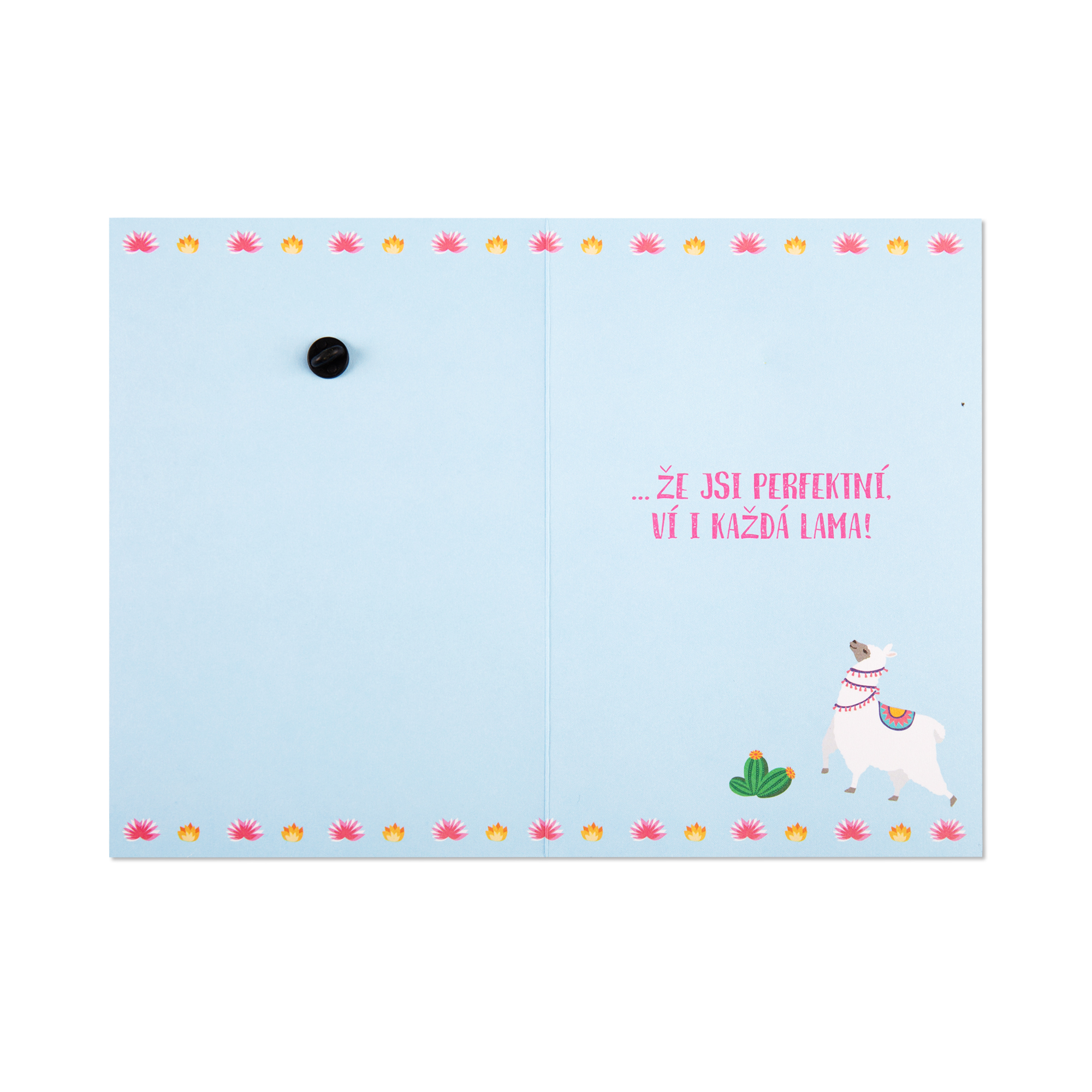 Klasické papírové přání je nedílnou součástí každé významné události. Krásně ilustrované přání k narozeninám však skrývá něco navíc. Malou roztomilou brož ve tvaru lamy, která nejen ozdobí celé přáníčko, ale vytvoří vašim blízkým dlouhodobou radost, kterou mohou mít stále při sobě. Brož stačí jednoduše odendat a připnout na bundu či batoh. Text přání: Další narozky? Nedělej z toho drama… …že jsi perfektní, ví i každá lama!