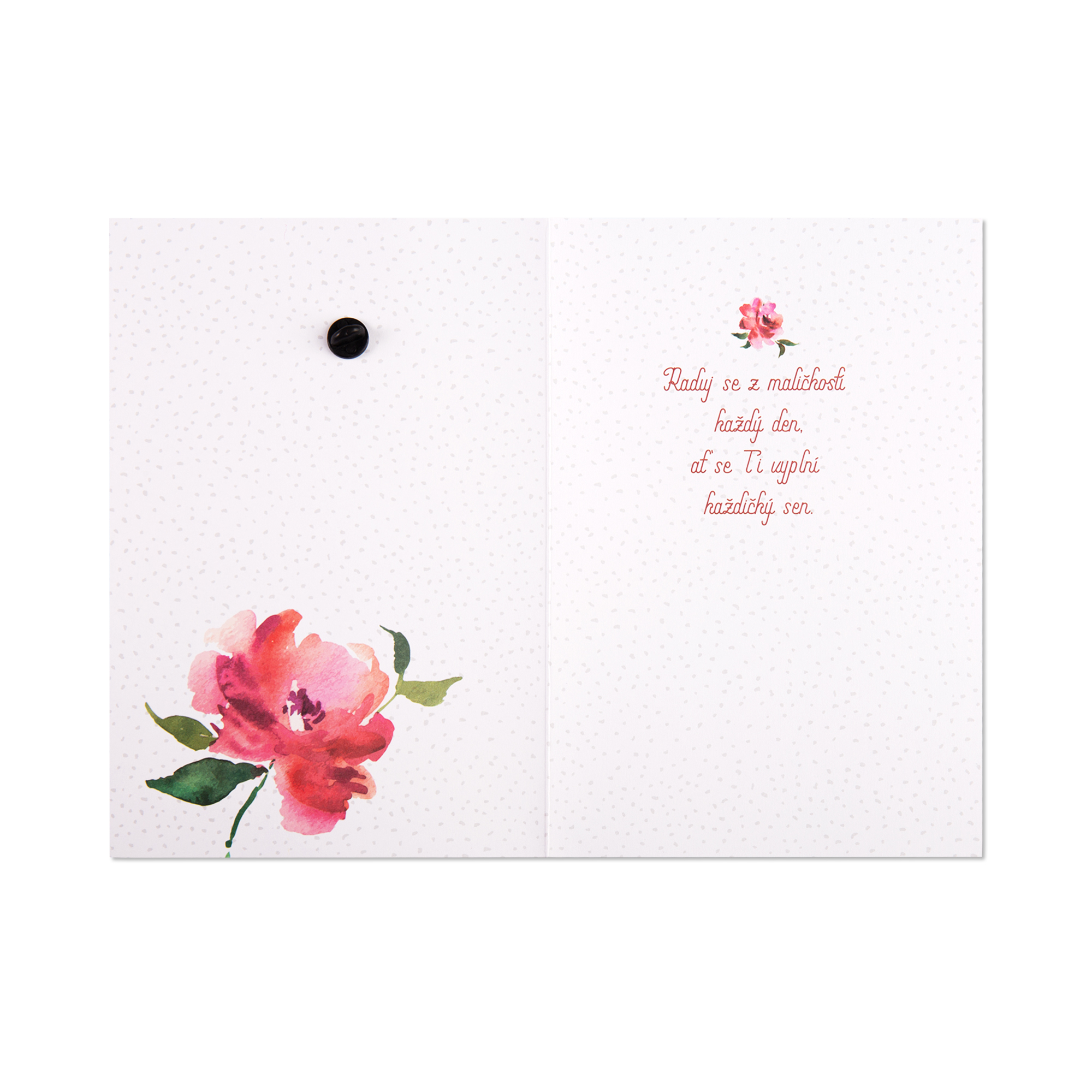 Klasické papírové přání je nedílnou součástí každé významné události. Krásně ilustrované přání však skrývá něco navíc. Malou roztomilou brož ve tvaru růže, která nejen ozdobí celé přáníčko, ale vytvoří vašim blízkým dlouhodobou radost, kterou mohou mít stále při sobě. Brož stačí jednoduše odendat a připnout na bundu či batoh. Text přání: K narozeninám Raduj se z maličkostí každý den, ať se Ti vyplní každičký sen.