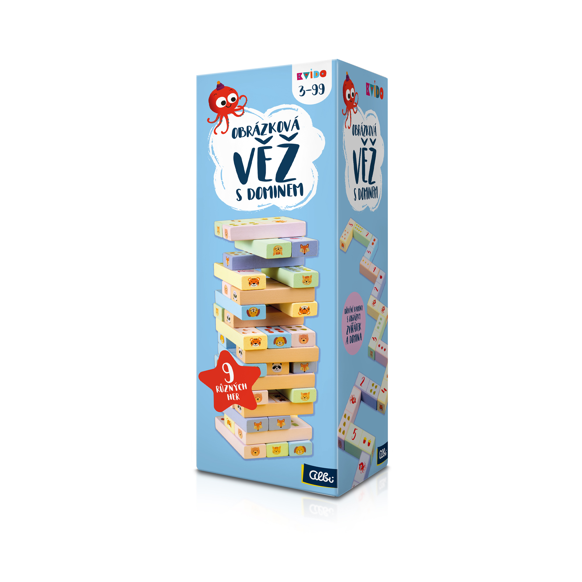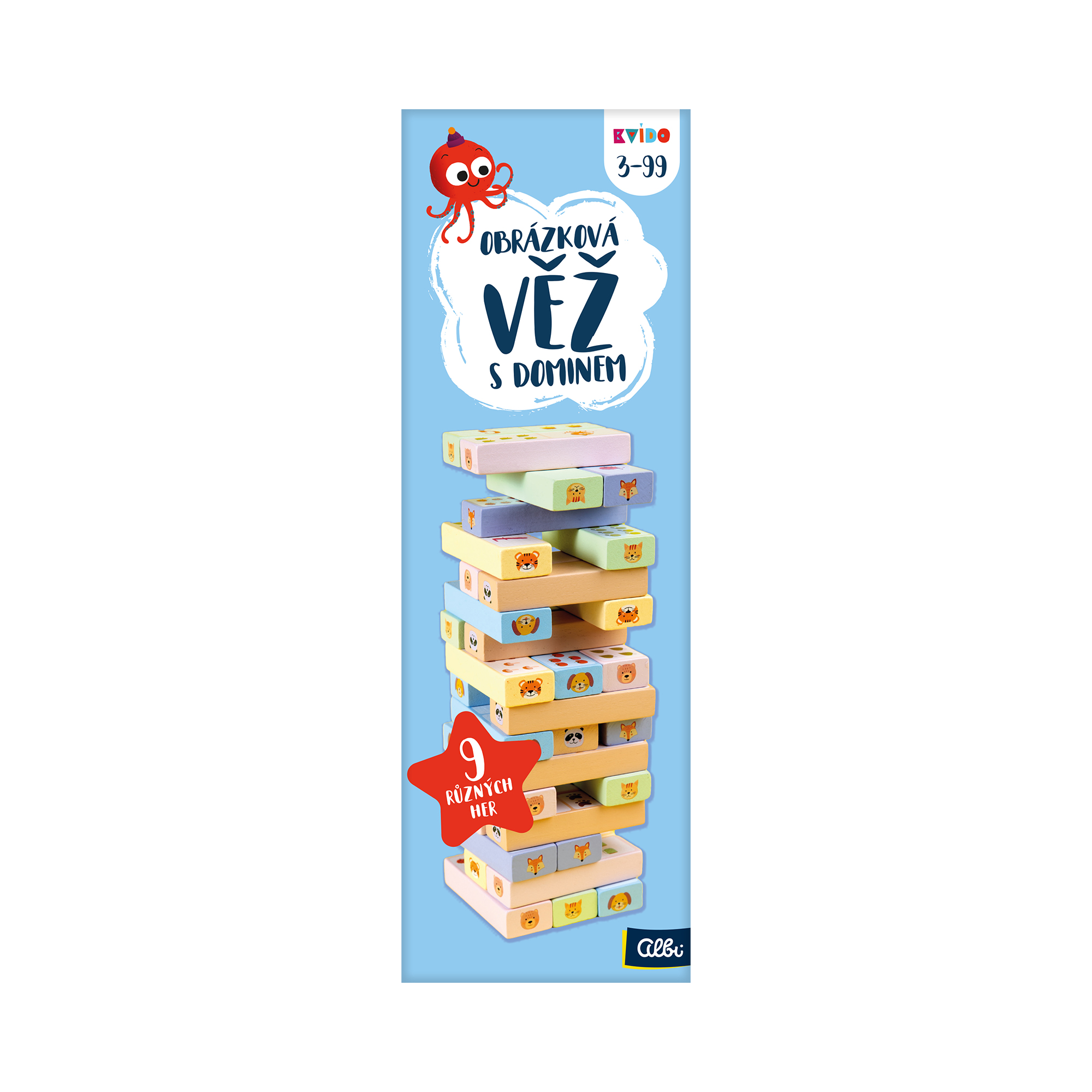 S Kvídovou obrázkovou věží si můžete zahrát nejméně 9 různých her: vytahujte podle obrázků na kostce z věže hrací kameny, stavte věž s pomocí kartiček na jednotlivá patra nebo si zahrajte klasické domino či jeho bleskovou variantu. Nechybí ani hry pro jednoho hráče, schovávačka nebo svižná běhačka. Obrázková věž 9v1 je krásně zpracovaná dřevěná variabilní hra, která zábaví celou rodinu s dětmi už od 3 let. Rozvíjí jemnou motoriku, koordinaci, jednoduché počítání a poznávání barev. Hra Obrázková věž s dominem obsahuje: 39 barevných dřevěných kamenů s obrázky zvířátek a domina, 1 dřevěnou kostku s obrázky, 6 pevných kartiček na stavění pater a pravidla k 9 různým hrám.