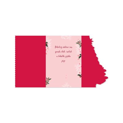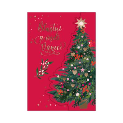 Unikátní vánoční přání s motivem ozdobeného stromečku a zlatou ražbou. Toto přání zaujme už na první pohled díky dvojitému rozevíracímu mechanismu. Na pravé straně je přání vyseknuté do siluety vánočního stromku, což mu dodává hravý 3D efekt. Levá strana si zachovává tradiční obdélníkový tvar a nese nápis Šťastné a veselé Vánoce. Po otevření odhalí vnitřní prostor s univerzálním textem a spoustuou místa pro dopsání vlastního věnování či podpisu. Text uvnitř přání: Pohodový sváteční čas, spoustu štěstí, radosti a bohatého ježíška přeje… Součástí balení je i bílá obálka. Rozměry: 12 × 17,3 cm