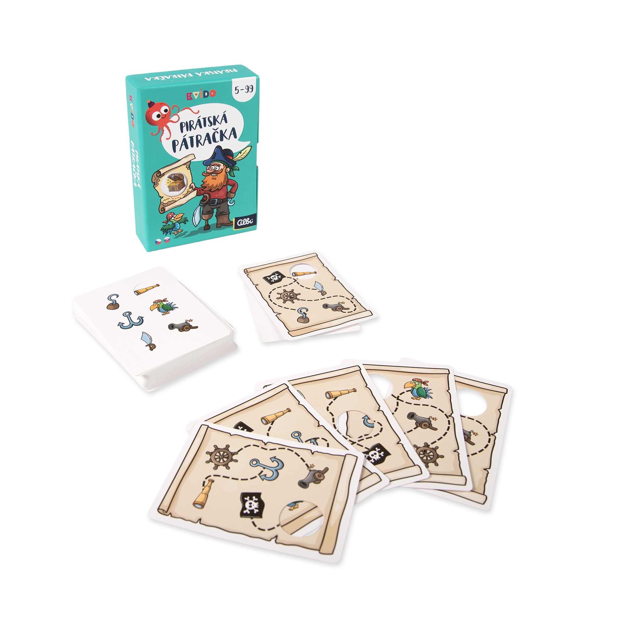 Pirátská pátračka – zábavná postřehová karetní hra pro děti Vydejte se na dobrodružnou výpravu s pirátským dalekohledem a objevte skrytý poklad na mapě! Stačí správně přiložit jednu kartu na druhou a podívat se skrz otvor – jen tak odhalíte, kde se ukrývá hledaný pirátský předmět. Cílem hry je spojit 2 karty tak, aby se v otvoru na horní kartě s mapou objevil správný pirátský symbol. Vyhrává hráč, který nasbírá nejvíce bodů. Tato originální postřehová karetní hra s otvory od Kvída procvičí rychlost, soustředění i zrakové vnímání. Díky jednoduchým pravidlům je ideální pro rodiny s dětmi od 5 let a malé milovníky pirátů a dobrodružství. Proč si hru zamilujete: Jednoduchá pravidla – začnete hrát během pár minut Rychlá a dynamická hra – ideální na cesty i krátké hraní Každé kolo je jiné – nové výzvy a kombinace karet Originální herní mechanismus – hledání obrázků skrz otvory v kartách Hra Pirátská pátračka – Kvído obsahuje: 54 oboustranných karet s otvory, pravidla hry v češtině a slovenštině.