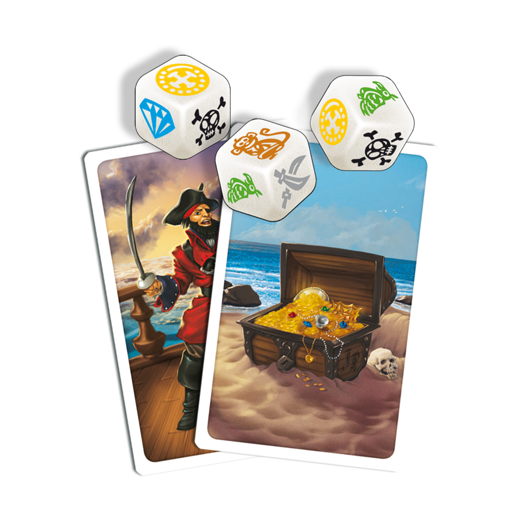 U všech mořských ďasů! Získejte pomocí pirátské lsti co nejvíce bodů za nejlepší kombinaci hozených kostek a dobrodružných pirátských karet. Odvážíte se riskovat, nebo se budete držet spíše při zemi? Jen ten nejbohatší pirát zvítězí! Pirátské kostky jsou jednoduchá kostková hra s velkou mírou náhody, založená na principu odhadu rizika. Hráči se střídají v házení kostkami, za jejichž různé kombinace získávají body. Každá kostka obsahuje šest symbolů – drahokam, zlaťák, papouška, opici, meč a lebku. Hra obsahuje: 40 karet, 8 pirátských kostek, 1 bodovací blok a pravidla.