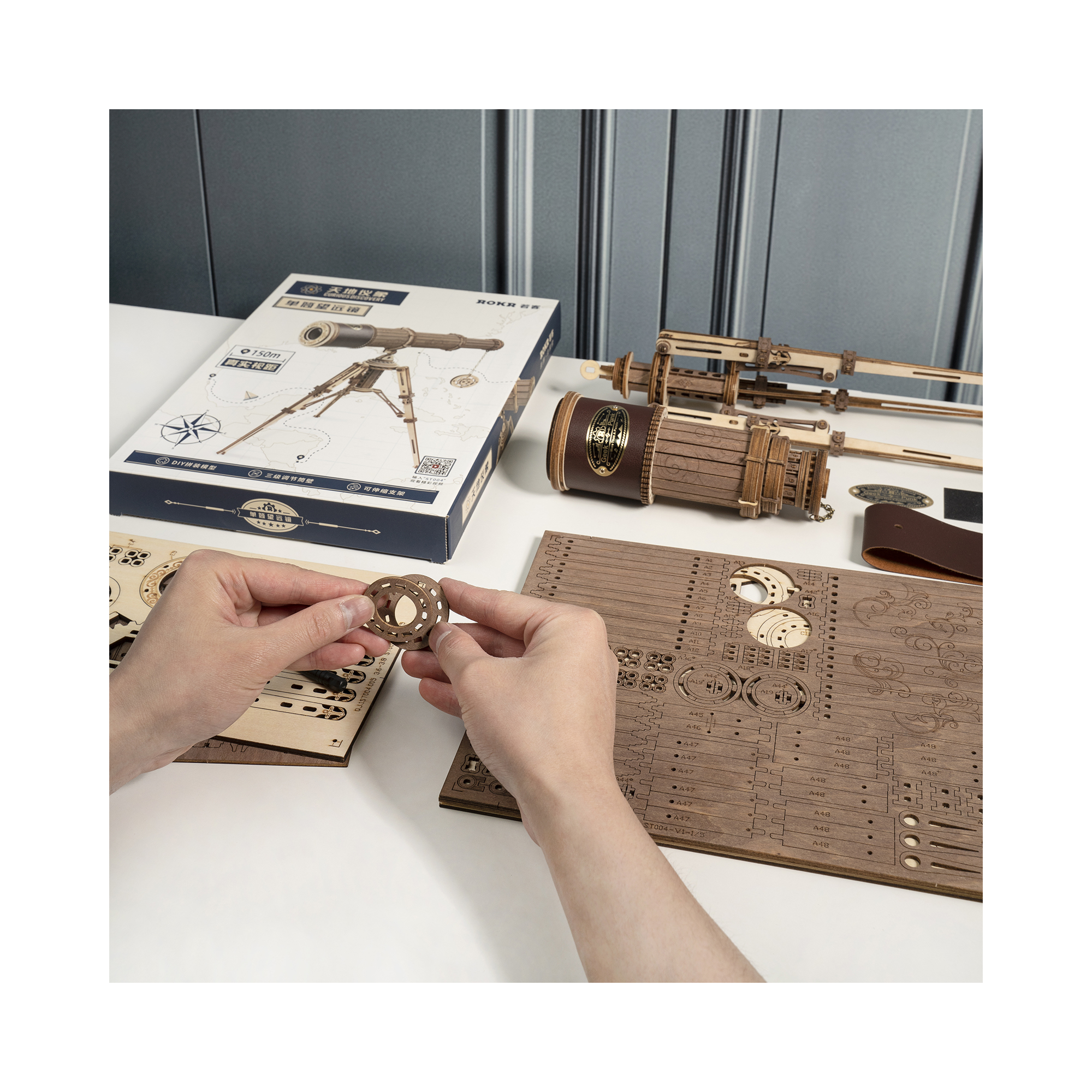 Kreativní stavebnice a dekorace v jednom Prozkoumejte svět s retro Pirátským dalekohledem – mechanickou stavebnicí ze dřeva značky Robotime, se kterou vlastnoručně sestavíte funkční dalekohled zdobený ornamenty, koženými prvky a krytkou s lebkou. Postavte si vlastní funkční dalekohled ve stylu dobrodruhů a pirátů minulých století. Tato dřevěná stavebnice vás nejen zabaví, ale také vám umožní vlastnoručně vytvořit stylový a plně funkční model s výsuvným stativem a skutečnou dohledovou vzdáleností až 150 metrů. S dřevěnou DIY (Do It Yourself = udělej si sám) stavebnicí si díky očíslovaným dílkům a obrázkovému návodu postavíte dalekohled úplně sami. Vše, co potřebujete, naleznete v balení. Po sestavení se dalekohled ze dřeva stává stylovou dekorací v pracovně, knihovně nebo v klučičím dětském pokoji. Tip na jedinečný dárek pro všechny fanoušky dobrodružství, pirátů, 3D puzzle a trpělivé milovníky skládání. Ponořte se do úchvatného světa z dřevěných dílků, které jsou precizně vyřezávané laserem a díky čepovému spoji do sebe krásně zapadají a drží pohromadě bez nutnosti použití lepidla. Technické informace Počet dílů: 314 Náročnost: 3/5 Odhadovaný čas sestavení: 2,5 hodiny Rozměr modelu: 33 × 24 × 32,5 cm