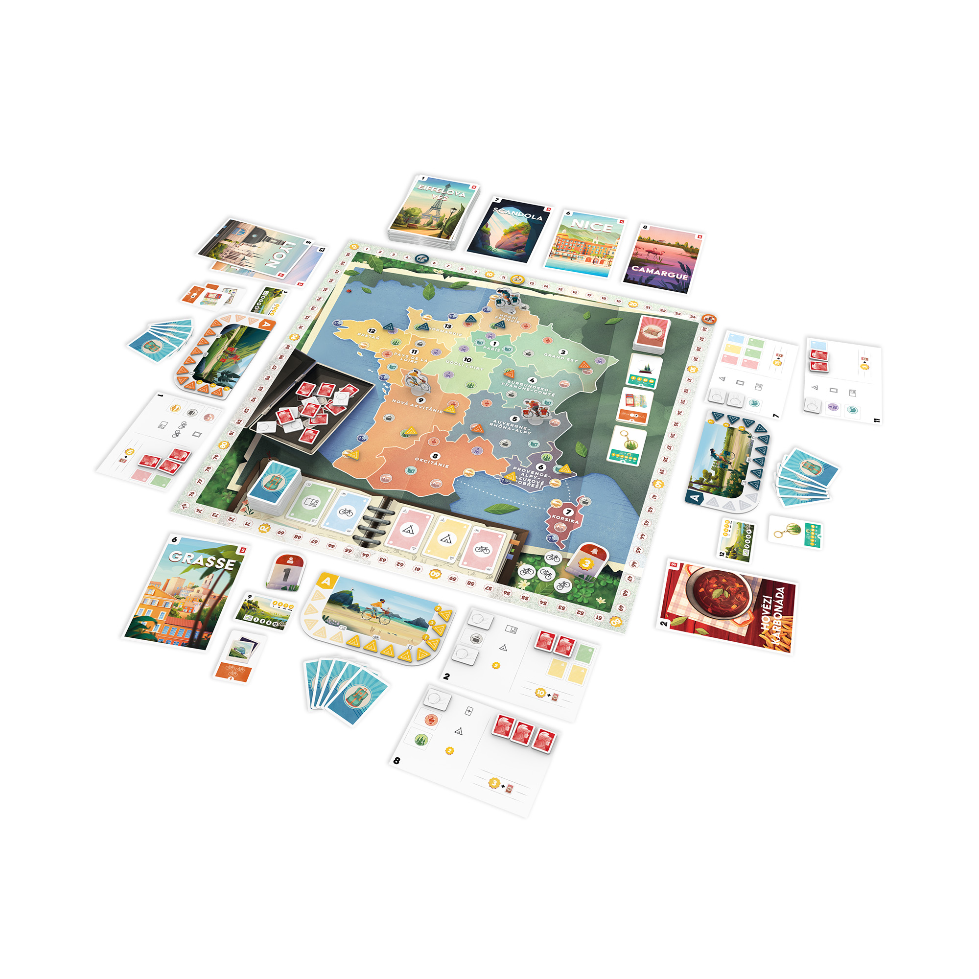 V této napínavé cestovatelské hře procestujete 13 francouzských regionů, nasbíráte pohlednice a utáboříte se na strategických místech. Sbírejte známky, abyste mohli posílat suvenýry, a získejte body, které vás dovedou k vítězství. Kdo se jako první podělí o svá dobrodružství? Hra obsahuje sólový režim. Součástí balení je vícejazyčné rozšíření Zázraky divočiny. Hra Pohlednice obsahuje: 1 herní desku, 52 pohlednic, 72 karet cestování, 5 dárkových karet, 13 karet s itinerářem, 60 žetonů známek/suvenýrů, 4 desky hráčů, 52 žetonů stanů, 4 figurky cyklistů, 4 stojánky, 4 bodovací žetony, 1 žeton prvního hráče, 4 žetony pohybu, 1 bonusový žeton, česká pravidla. Rozšíření Zázraky divočiny obsahuje: 13 pohlednic, česká pravidla.