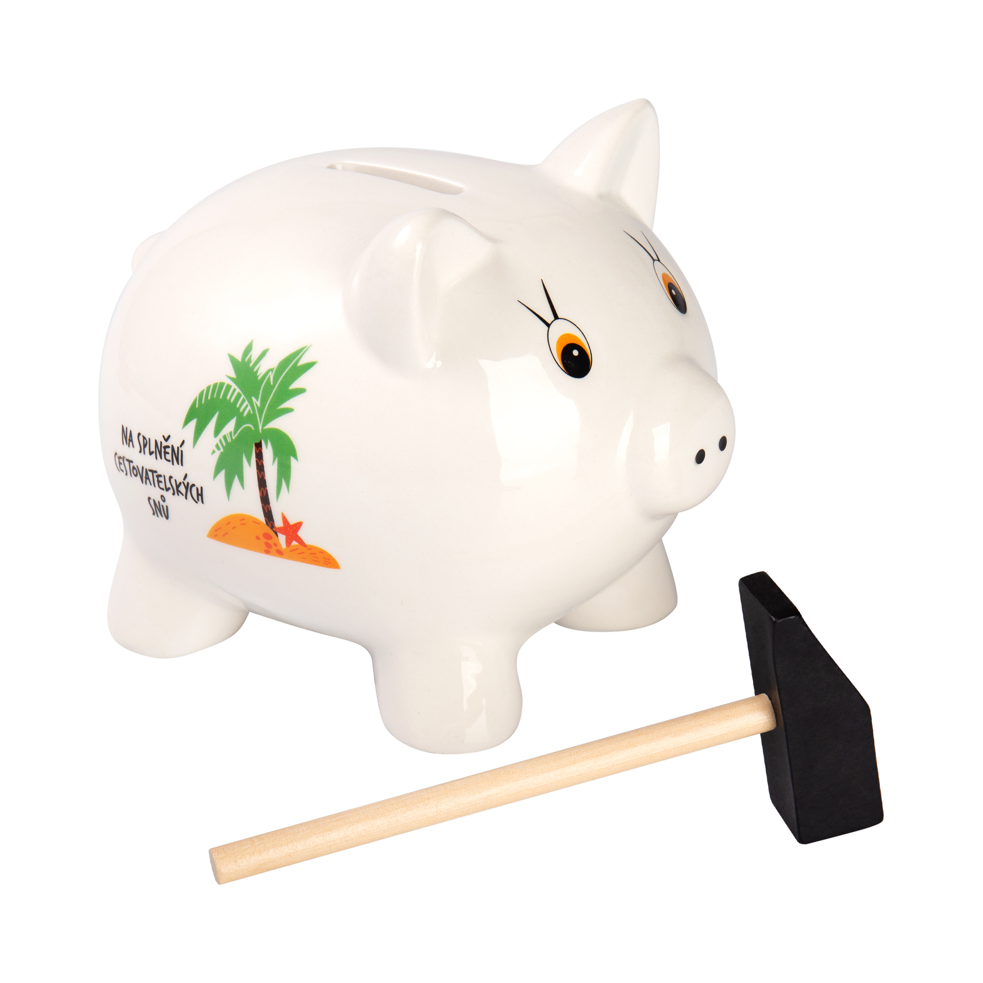 Klasické pokladničky ve tvaru prasátka s milým věnováním potěší všechny šetřílky. Součástí balení je i kladívko, které vás k vytoužené částce nakonec dostane. Prasátkové pokladničky nemají otvor pro vyndavání hotovosti, proto se nemusíte bát, že byste sem tam něco vyndali a hned utratili. Až budete mít našetřený potřebný obnos, stačí vzít kladívko a prasátko rozbít. Pak už je jen na vás, za co naspořené peníze utratíte. Rozměry: 14 cm × 15 cm × 16 cm Materiál: Porcelán