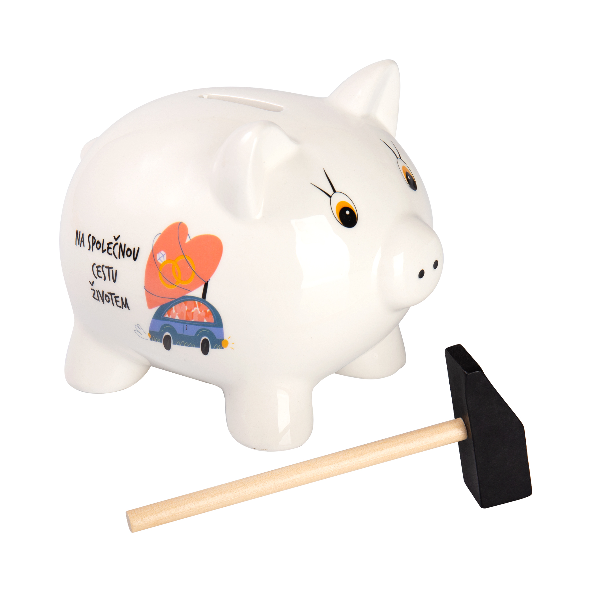 klasické pokladničky ve tvaru prasátka s milým věnováním potěší všechny šetřílky. Součástí balení je i kladívko, které vás k vytoužené částce nakonec dostane. prasátkové pokladničky nemají otvor pro vyndavání hotovosti, proto se nemusíte bát, že byste sem tam něco vyndali a hned utratili. Až budete mít našetřený potřebný obnos, stačí vzít kladívko a prasátko rozbít. Pak už je jen na vás, za co naspořené peníze utratíte. Rozměry: 14 cm × 15 cm × 16 cm Materiál: Porcelán