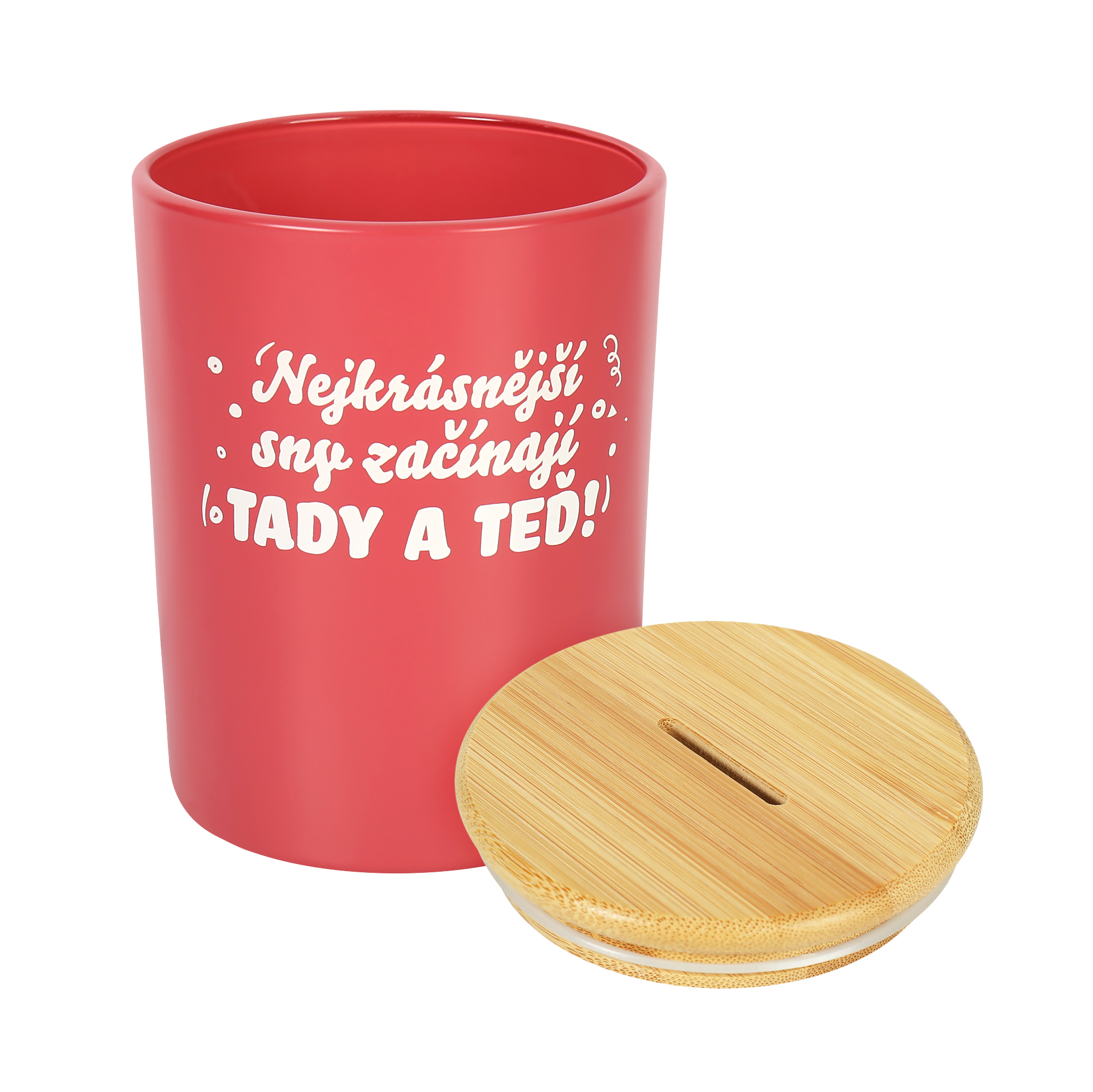Humorné pokladničky s věnováním ve veselých pastelových barvách jsou skvělým dárkem k narozeninám, svátku nebo jen tak pro radost. Pokladničky mají na víčku otvor pro vhození mincí či bankovek. Dřevěné víčko s gumovým těsněním pevně drží, ale i přes to se dá snadno odejmout. Pokladničky jsou různě barevné a mají unikátní texty. Lze je využít jako milý dárek k mnoha příležitostem.  Rozměry: 10,5 cm × 13,5 cm Materiál: Sklo a dřevo