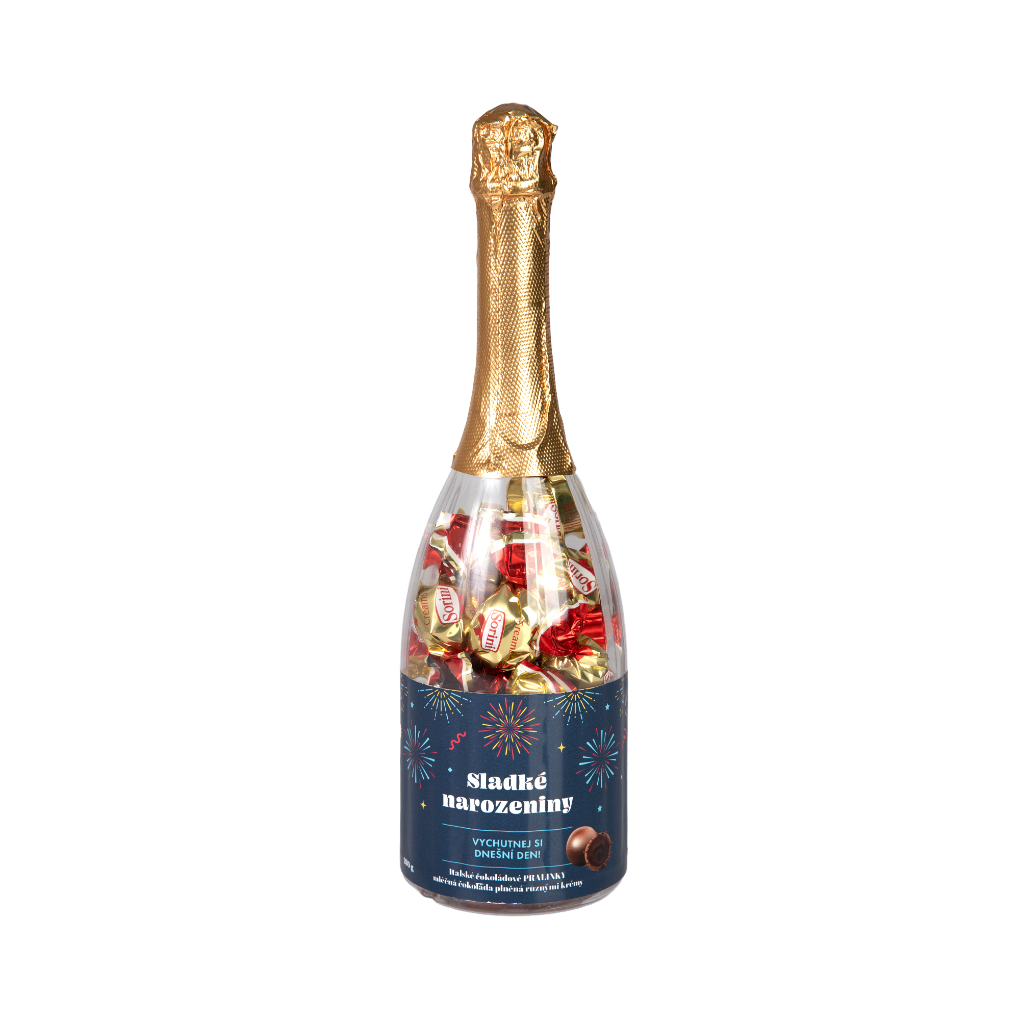 Pralinky v láhvi jsou originálním a stylovým dárkem pro všechny, kteří si rádi užívají sváteční chvíle trochu jinak! Skvělá volba na dárek k narozeninám – obzvlášť pro ty, kteří se raději vyhnou alkoholu. Na první pohled vypadá láhev šampaňského zcela obyčejně, ale skrývá lahodné pralinky z mléčné čokolády plněné lískooříškovým krémem a cereáliemi, které si jednoduše vychutnáte odšroubováním spodní části láhve. Nápis Sladké narozeniny oslavence dozajista moc potěší. Láhev si pak může nechat jako milou vzpomínku a díky odendavacímu víku vespod může láhev využít na maličkosti. Hmotnost: 280 g Pralinky v láhvi Složení: cukr, rostlinné tuky v různém poměru (kokosový, z palmových jader, palmový), sušená MLÉČNÁ SYROVÁTKA, kakaové máslo, sušené plnotučné MLÉKO, kakaová hmota, cereálie (kukuřičná mouka, rýžová mouka, PŠENIČNÁ mouka, rýžová mouka, PŠENIČKÁ MOUKA, cukr, kakaový prášek se sníženým obsahem tuku, extrakt z JEČNÉHO sladu, jedlá sůl) 4%, kakaový prášek se sníženým obsahem tuku, sušené odstředěné MLÉKO, LÍSTKOVÉ OŘECHY 0,5%, emulgátor: SÓJOVÝ lecitin, aromata. Může obsahovat jiné skořápkové plody. Obsah kakaové sušiny v mléčné čokoládě nejméně 27%, mléčné sušiny nejméně 14%. Alergeny: Výrobek obsahuje obiloviny obsahující lepek, sójové boby, mléko a skořápkové plody. Výživové údaje na 100 g: energetická hodnota 2206 kJ/528 kcal tuky 29 g – z toho nasycené mastné kyseliny 21 g sacharidy 62 g – z toho cukry 58 g vláknina 1,9 g bílkoviny 4,6 g sůl 0,30 g Hmotnost: 280 g Skladujte na suchém místě a chraňte před teplem.
