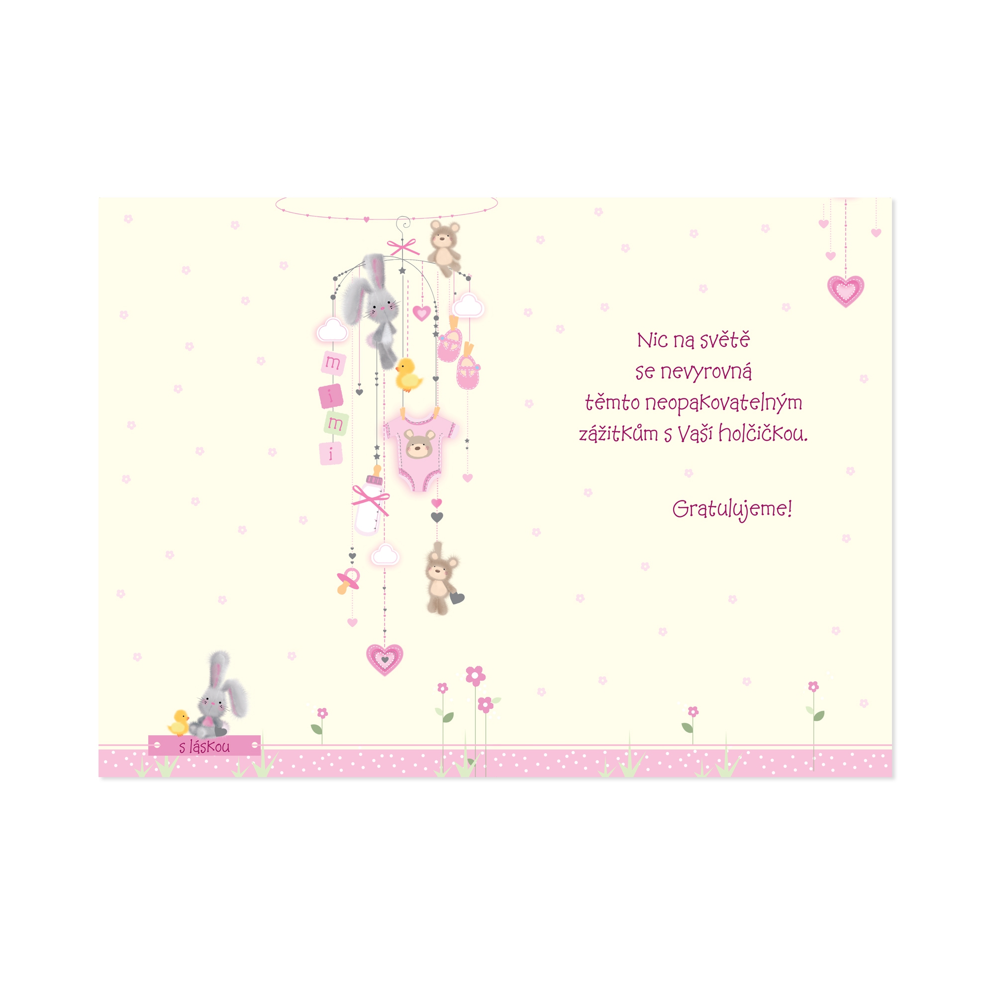 Papírová přáníčka se znovu stala senzací a součástí gratulace k narození potomka. Pokud se vašim přátelům či známým narodila holčička, s růžovým přáníčkem nesáhnete vedle. Text na přáníčku: K narození holčičky První úsměvy, první slůvka, chvilky něhy, okamžiky naplněné štěstím a láskou… Text uvnitř přáníčka: Nic na světě se nevyrovná těmto neopakovatelným zážitkům s Vaší holčičkou. Gratulujeme!