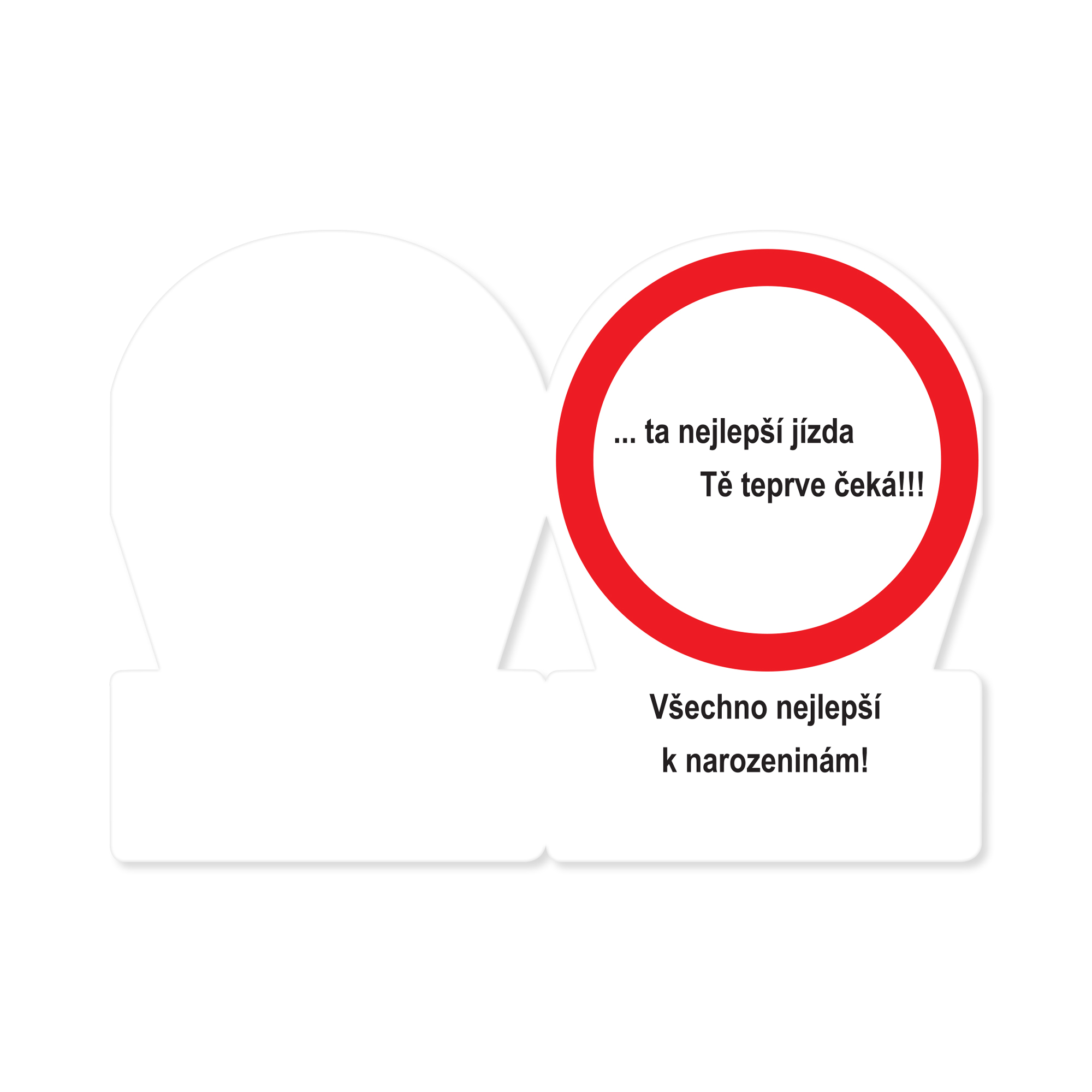 Jubilejní narozeninové přání s výsekem ve tvaru dopravní značky a s věnováním uvnitř. Věnování: "K 50. narozeninám. Žádný spěch… ta nejlepší jízda Tě teprve čeká! Všechno nejlepší k narozeninám!". Pod textem pak zůstává dostatek místa pro váš podpis, případně kratší vzkaz. Součástí přání je i bílá papírová obálka. Tip na dárek ke kulatým narozeninám pro všechny řidiče. Rozměry přání: 19,5 × 13,5 cm