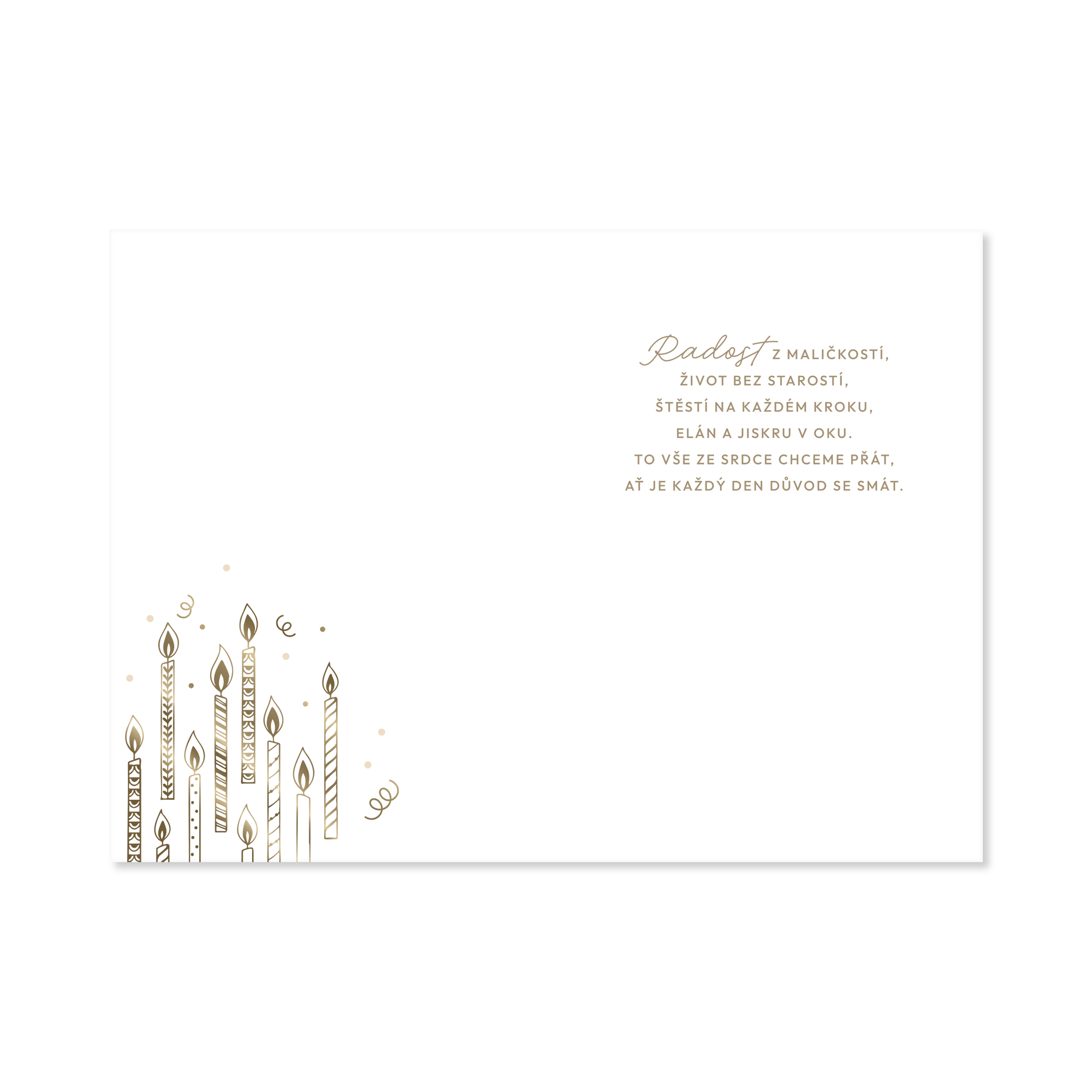 Jubilejní narozeninové přání s věnováním uvnitř. Velkou číslici 60 doplňuje motiv dortových svíček – vše ve zlaté ražbě na bílém podkladu. Uvnitř najdete věnování: "Radost z maličkostí, život bez starostí, štěstí na každém kroku, elán a jiskru v oku. To vše ze srdce chceme přát, ať je každý den důvod se smát!". Pod textem pak zůstává dostatek místa pro váš podpis, případně vlastní vzkaz. Součástí přání je i bílá papírová obálka. Tip na dárek ke kulatým narozeninám. Rozměry přání: 19,5 × 13,5 cm