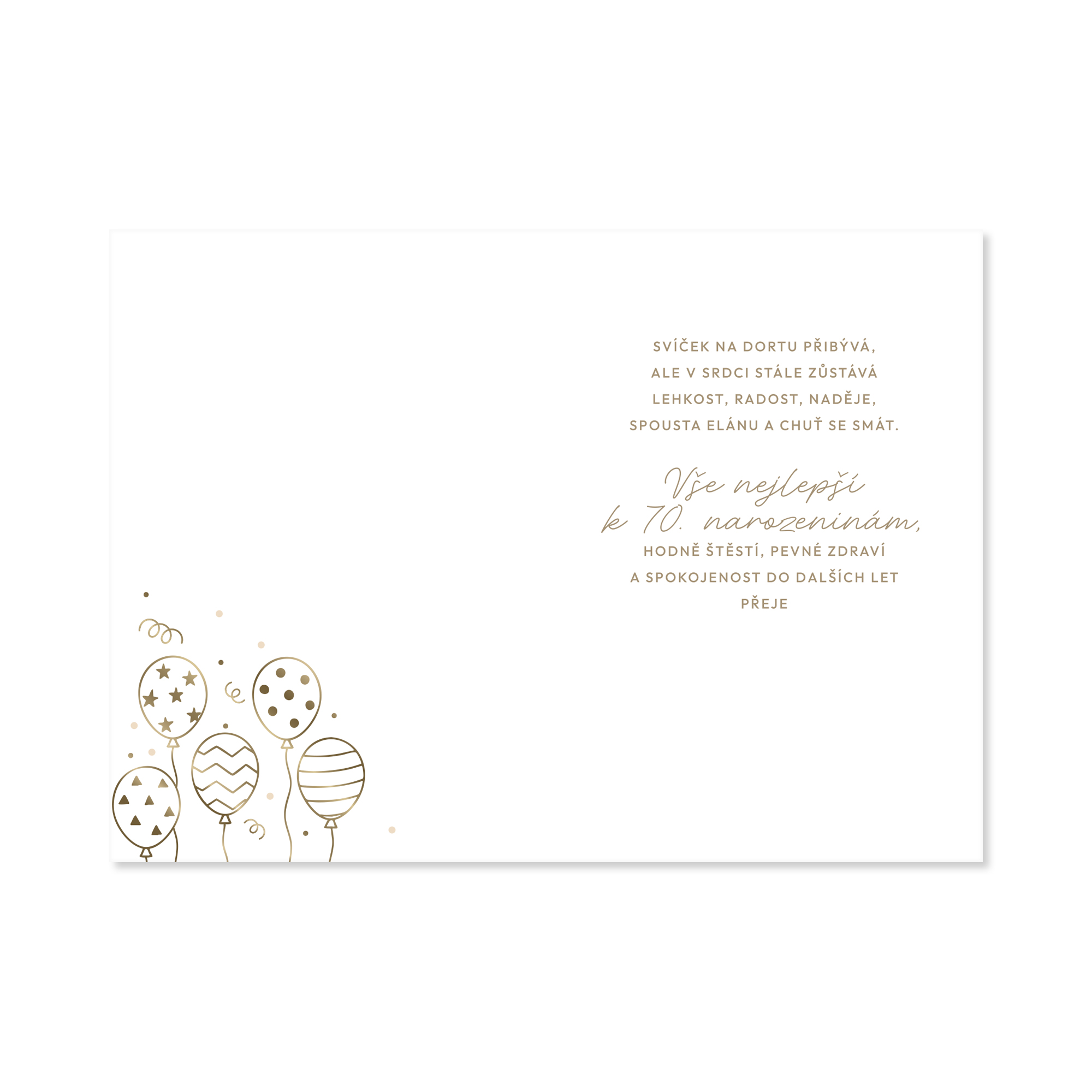 Jubilejní narozeninové přání s věnováním uvnitř. Velkou číslici 70 doplňuje motiv balónků – vše ve zlaté ražbě na bílém podkladu. Uvnitř najdete věnování: "Svíček na dortu přibývá, ale v srdci stále zůstává lehkost, radost, naděje, spousta elánu a chuť se smát. Vše nejlepší k 70. narozeninám, hodně štěstí, pevné zdraví a spokojenost do dalších let přeje (…)". Pod textem pak zůstává dostatek místa pro váš podpis, případně vlastní vzkaz. Součástí přání je i bílá papírová obálka. Tip na dárek ke kulatým narozeninám. Rozměry přání: 19,5 × 13,5 cm