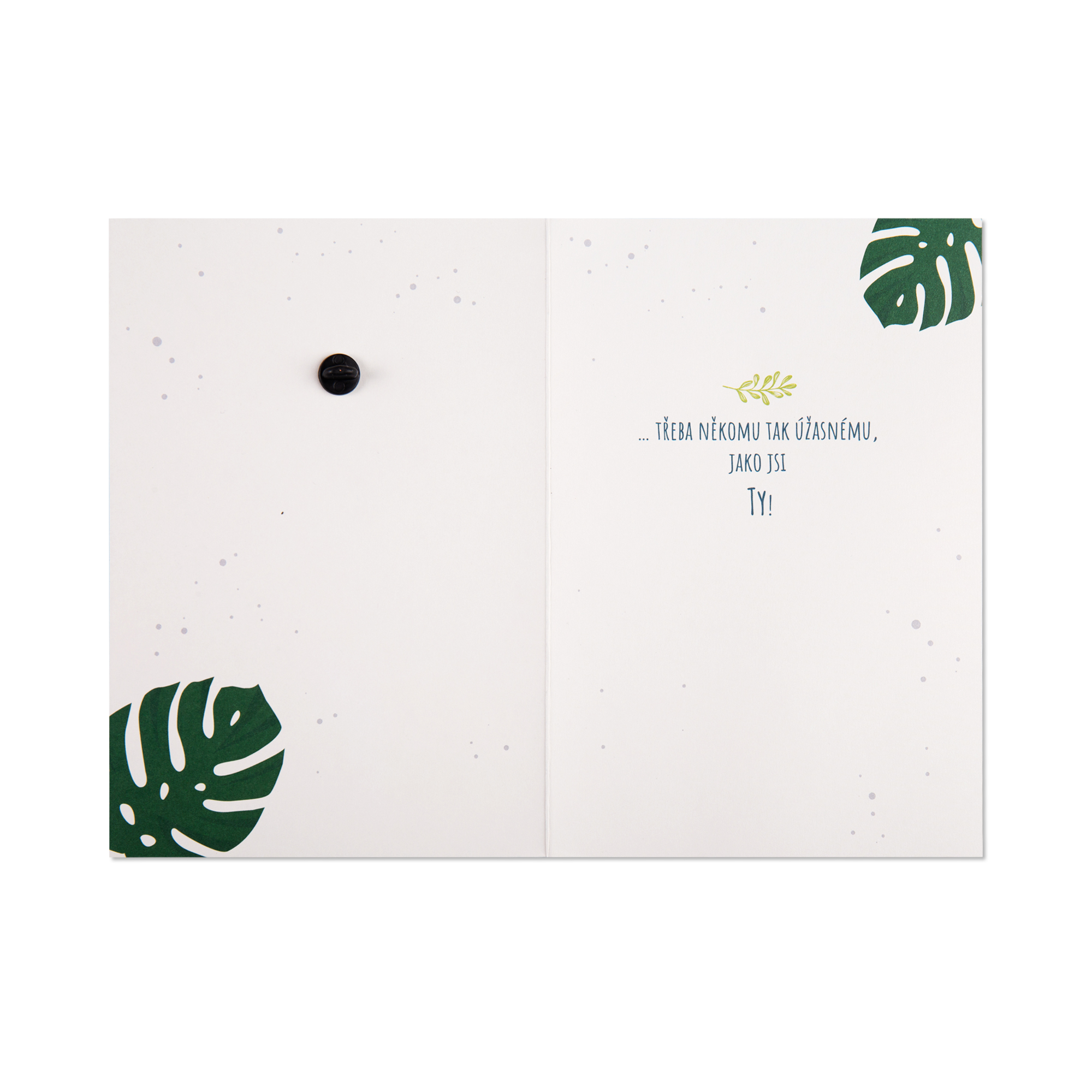 klasické papírové přání je nedílnou součástí každé významné události. Krásně ilustrované přání však skrývá něco navíc. Malou roztomilou brož ve tvaru zelené monstery, která nejen ozdobí celé přáníčko, ale vytvoří vašim blízkým dlouhodobou radost, kterou mohou mít stále při sobě. Brož stačí jednoduše odendat a připnout na bundu či batoh. Text přání: Každý den je možné někomu udělat radost… …třeba někomu tak úžasnému, jako jsi Ty!