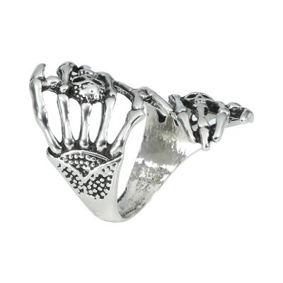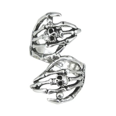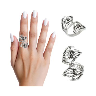 Efektní kovový prsten ve tvaru dvou dlaní kostlivce skvěle doladí kostým na Halloween, karneval či strašidelnou párty. Prsten se zašlým stříbrným efektem má propracované detaily rukou kostlivce, které jsou zdobené drobnými lebkami. Pro další párty doplňky a dekorace s motivem kostlivců můžete navštívit naši tematickou kategorii Halloween. Materiál: kov Balení obsahuje: 1 ks prstenu Není vhodné pro děti do 14 let.