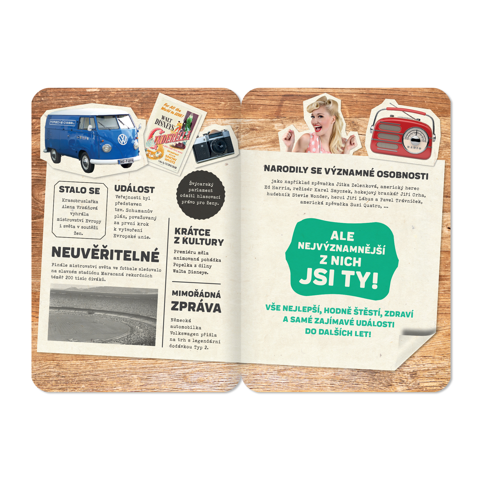 Udělejte radost retro přáníčkem a zavzpomínejte společně s oslavencem. Na přání najdete zajímavé události, které se v daném roce staly, a také známé osobnosti, které se v témže roce narodily. Oslavenec se tak může dozvědět, co důležitého se v roce jeho narození stalo.  Rozměry přáníčka: 13,5 cm × 19,5 cm
