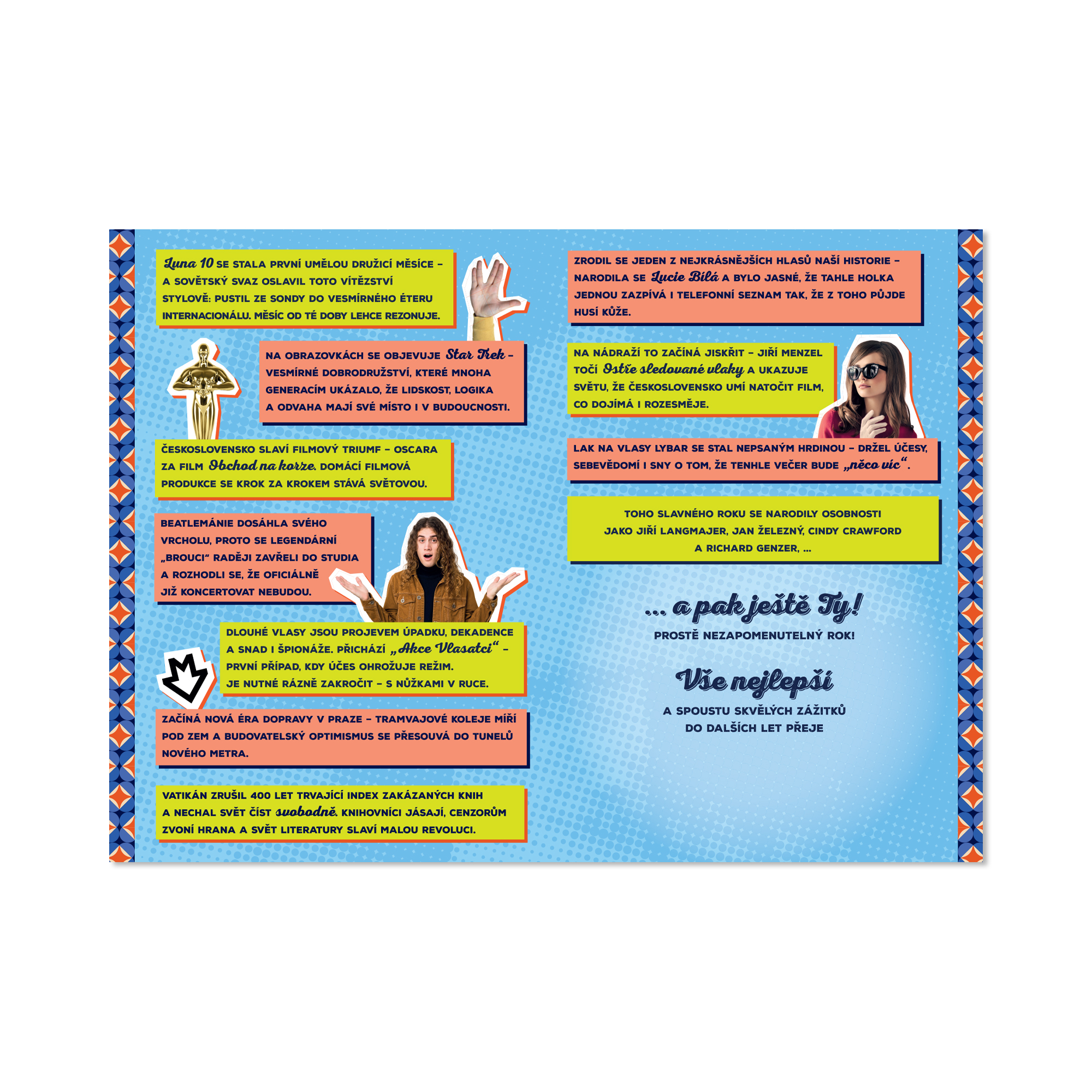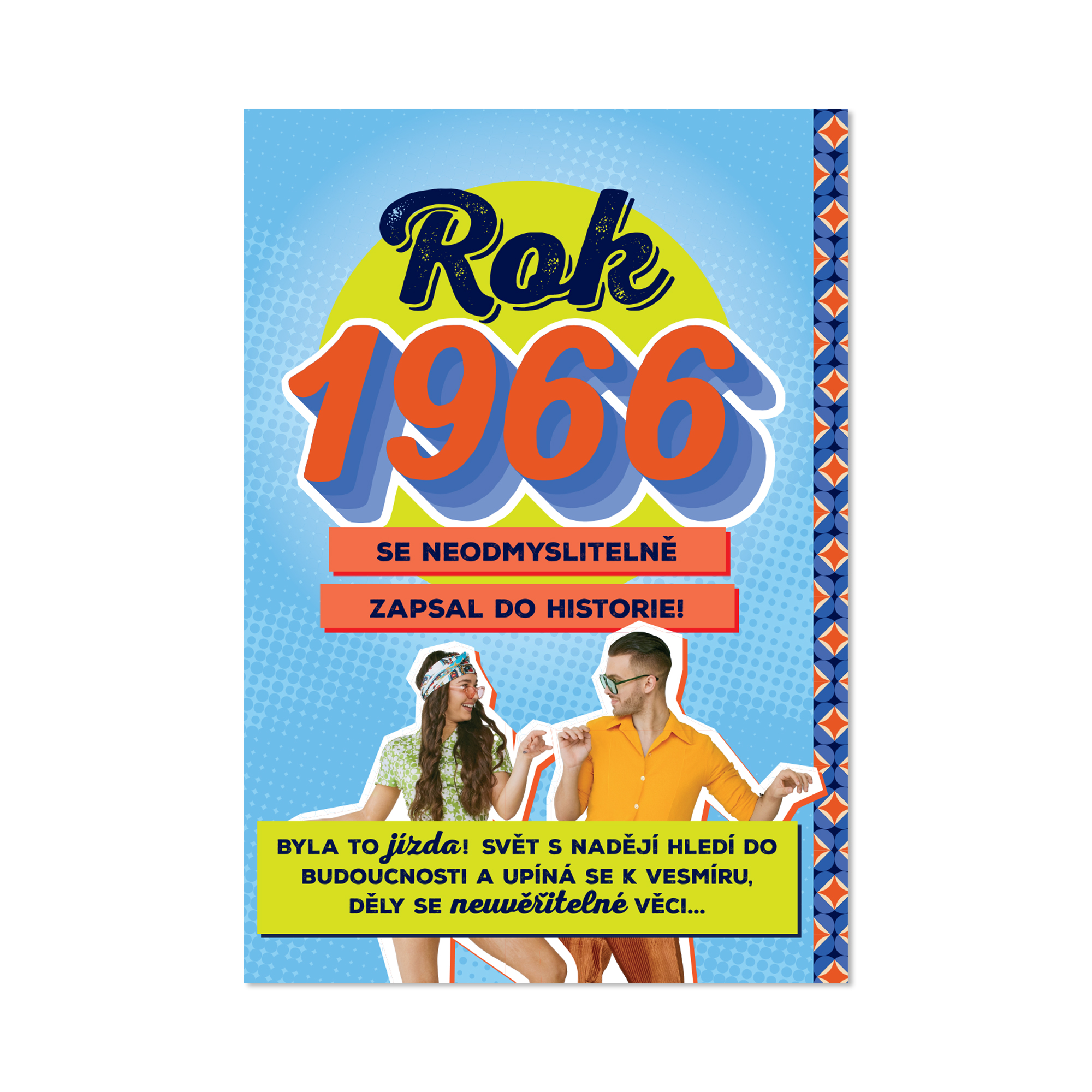 Svět v roce 1966 s nadějí hleděl do budoucnosti a upínal se k vesmíru. Luna 10 se stala první umělou družicí měsíce a na obrazovkách se objevil Star Trek. Dlouhé vlasy byly u mužů nepřípustné a světlo světa spatřil třeba herec Jiří Langmajer. Udělejte radost retro přáníčkem a zavzpomínejte společně s oslavencem, co výjimečného se v roce jeho narození stalo. Na přání najdete zajímavé události, které se v daném roce odehrály, a také známé osobnosti, které se v témže roce narodily. Rozměry přáníčka: 13,5 cm × 19,5 cm