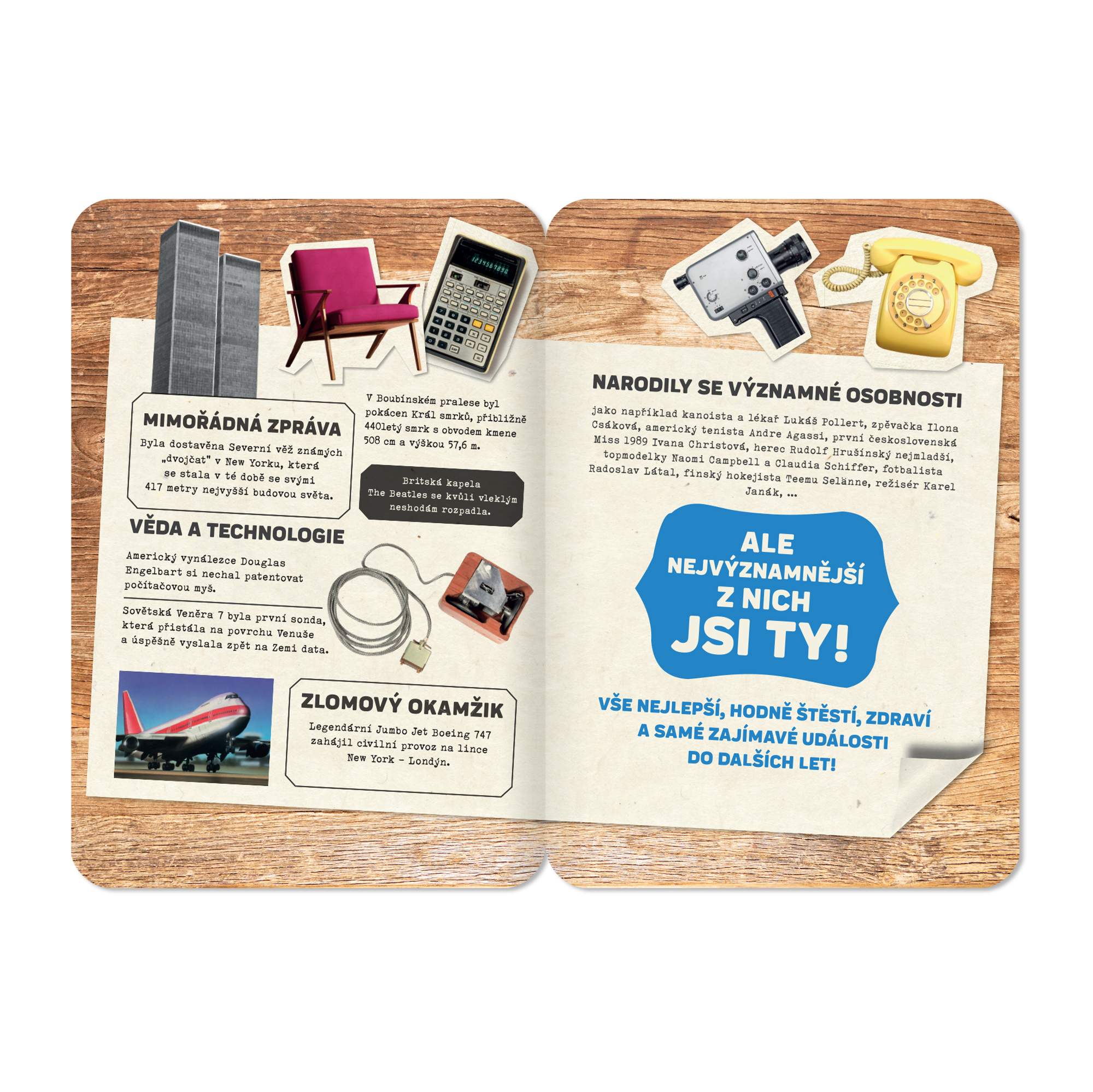 V roce 1970 se stala spousta významných událostí. Poprvé se konal mezinárodní den Země, došlo k nehodě na americké vesmírné lodi Apollo 13, britská kapela The Beatles se rozpadla a na svět přišel třeba herec Rudolf Hrušínský nejmladší. Udělejte radost retro přáníčkem a zavzpomínejte společně s oslavencem, co výjimečného se v roce jeho narození stalo. Na přání najdete spoustu zajímavých událostí, které se v daném roce odehrály, a také známé osobnosti, které se v témže roce narodily. Rozměry přáníčka: 13,5 cm × 19,5 cm