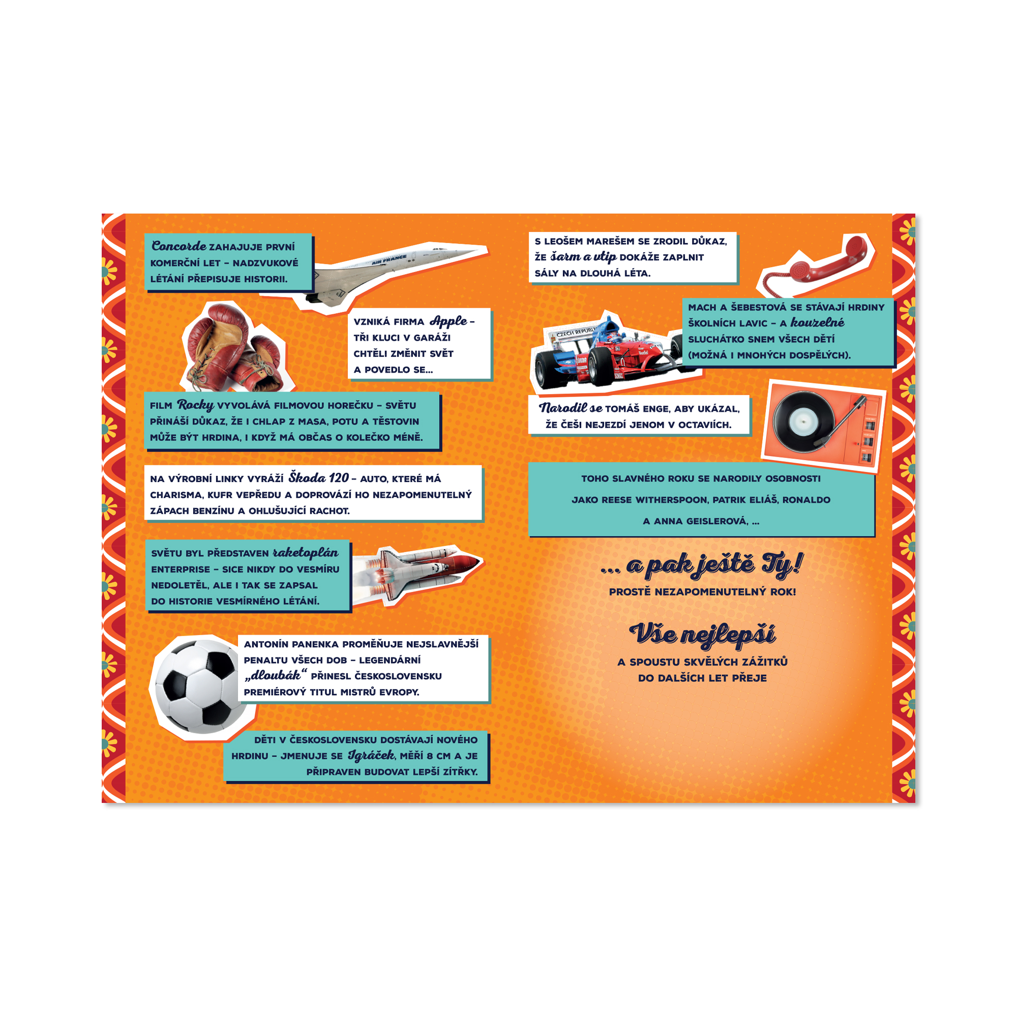 Svět v roce 1976 přivítal spoustu novinek. Zrodila se firma Apple, na filmovém plátně zazářil Rocky a na výrobní linku vyrazila Škoda 120. Stáváme se mistry Evropy ve fotbale a na svět přichází třeba herečka Anna Geislerová. Udělejte radost retro přáníčkem a zavzpomínejte společně s oslavencem, co výjimečného se v roce jeho narození stalo. Na přání najdete zajímavé události, které se v daném roce odehrály, a také známé osobnosti, které se v témže roce narodily. Rozměry přáníčka: 13,5 cm × 19,5 cm