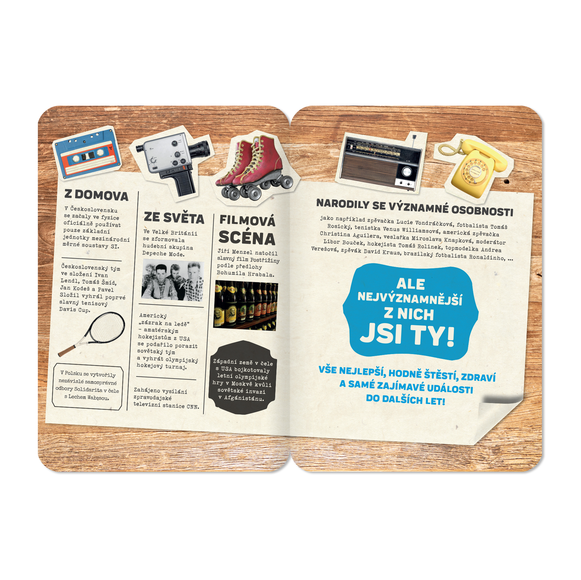 Udělejte radost retro přáníčkem a zavzpomínejte společně s oslavencem. Na přání najdete zajímavé události, které se v daném roce staly, a také známé osobnosti, které se v témže roce narodily. Oslavenec se tak může dozvědět, co důležitého se v roce jeho narození stalo.  Rozměry přáníčka: 13,5 cm × 19,5 cm