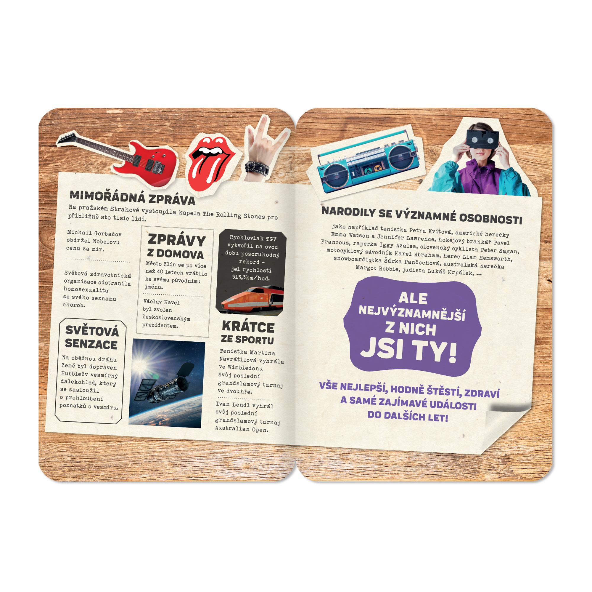 Udělejte radost retro přáníčkem a zavzpomínejte společně s oslavencem. Na přání najdete zajímavé události, které se v daném roce staly, a také známé osobnosti, které se v témže roce narodily. Oslavenec se tak může dozvědět, co důležitého se v roce jeho narození stalo. Rozměry přáníčka: 13,5 cm × 19,5 cm