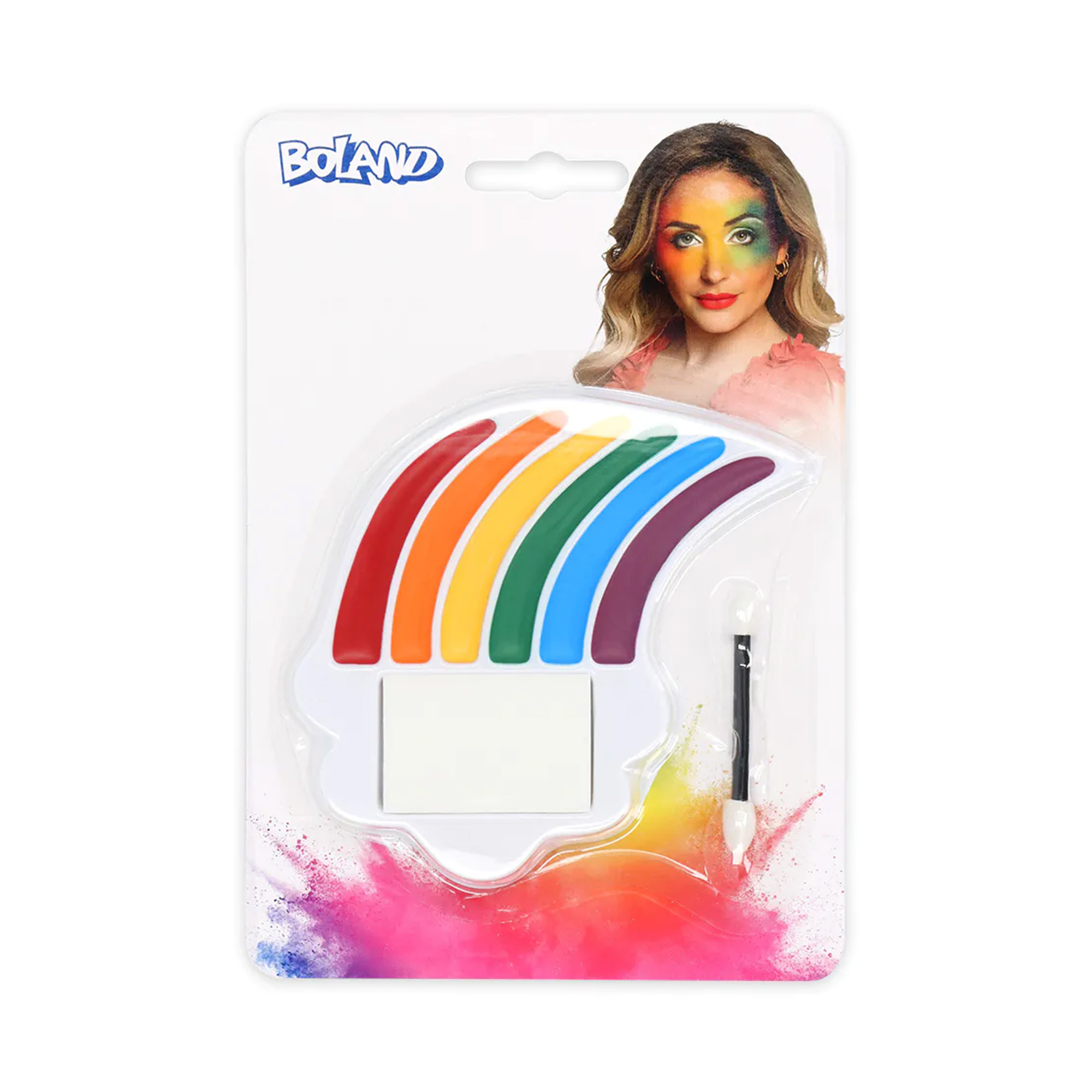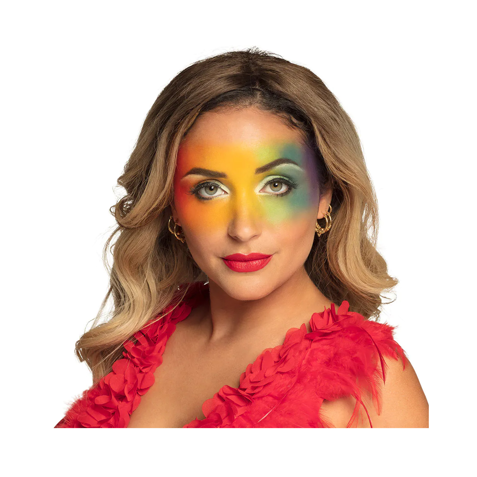 Sada barev na obličej v barvách duhy skvěle doplní váš kostým na letní festival nebo duhovou Pride párty. Barevnou paletku využijete i jako zábavu na dětské oslavě nebo karnevalu. V sadě najdete paletku s šesti barvami, dvojitý aplikátor a houbičku – vše, co potřebujete k vytvoření okouzlujícího rainbow líčení. Barvy jsou na olejové bázi, krásně drží a nerozmazávají se. Po akci je snadno odstraníte pomocí odličovacího mléka, oleje nebo micelární vody. Balení obsahuje: 6,2 g tukové barvy na obličej ve tvaru duhy (modrá, zelená, oranžová, fialová, červená, žlutá), houbičku a dvojitý aplikátor