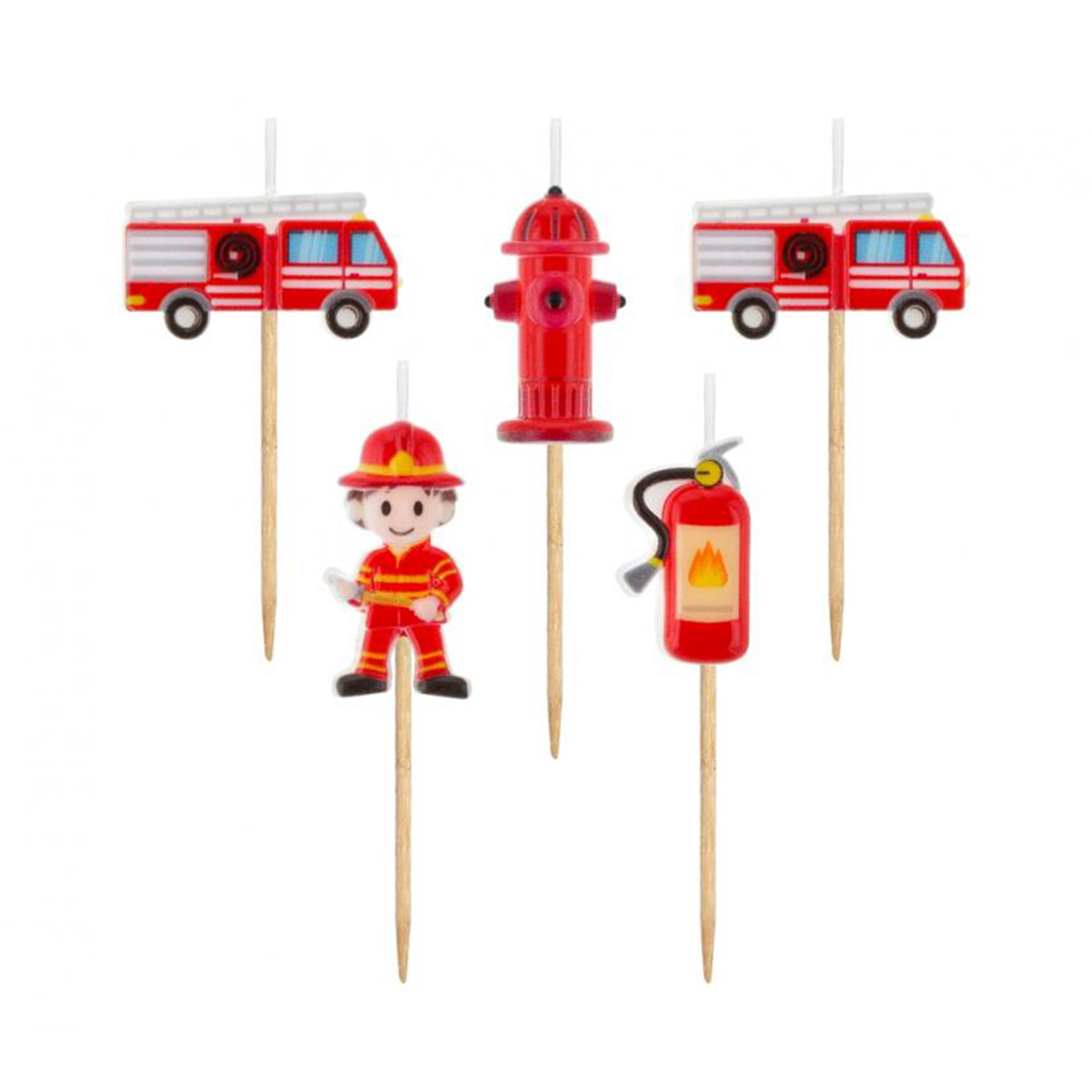 Veselá sada dortových svíček s motivem na téma hasiči, jako krásný doplněk narozeninového dortu.  dortové svíčky s veselými motivy jsou vhodné pro slavnostní okamžiky jako jsou narozeniny, dětské oslavy a tematické párty. Postup: Svíčky zapíchněte do dortu nebo do jiného měkkého podloží a před zapálením zkontrolujte zda směřují vzhůru. Upozornění: Doporučujeme produkt zapalovat ve volném, nejlépe větraném prostoru a v dostatečné vzdálenosti od stojících osob. Jako u všech hořlavin je třeba důsledně dbát na bezpečnost! Sada obsahuje: 5 kusů svíček s motivem na téma hasiči