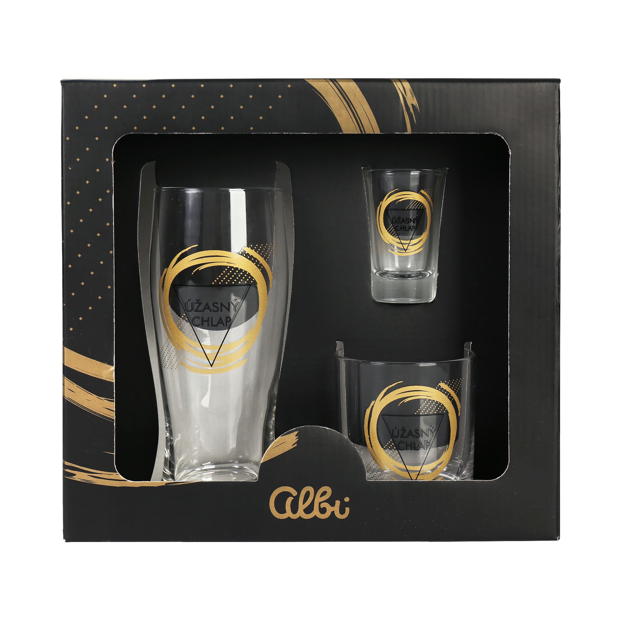Najít dárek pro muže není kolikrát lehký úkol. Namísto 28. sprchového gelu se raději inspirujte v kolekci Mužská záležitost od Albi. Jednotný design dovoluje produkty navzájem kombinovat, a tak vždy vyberete ten nejlepší dárek. sada sklenic na alkohol v pánském designu je určena pro muže, kterým není jedno, z čeho si vychutnají kapku něčeho ostřejšího. sklenice jsou zabaleny v dárkové krabici a mají jednotný design s potiskem Úžasný chlap, což z nich dělá skvělý dárek pro pořádného muže. Sada obsahuje: půllitrovou sklenici na pivo, skleničku na panáka a sklenici na whiskey.