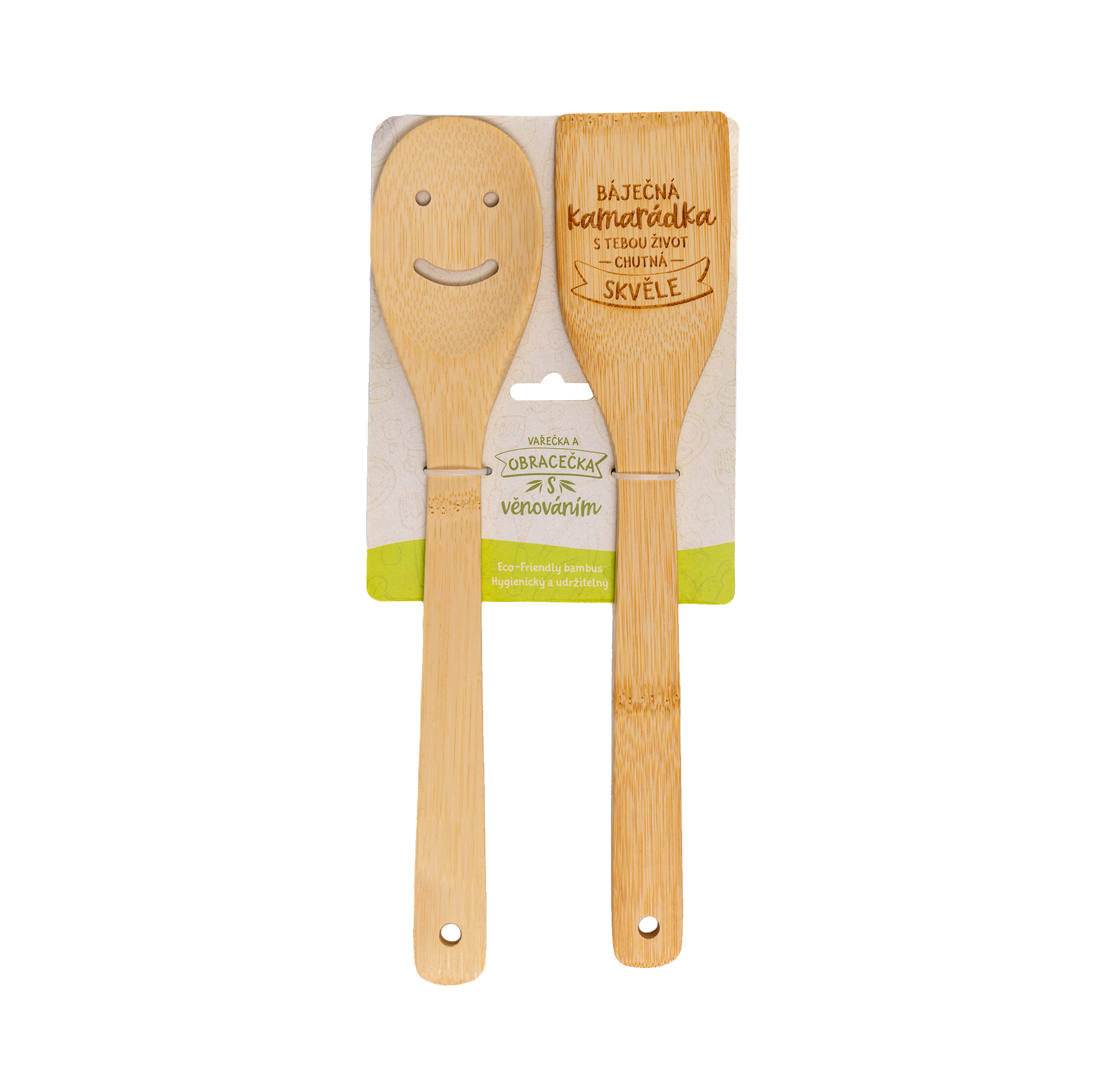 Udělejte radost nejen přírodě, ale také svým blízkým s milým a praktickým dárkem. sada vařeček s věnováním je eko-friendly a udržitelné kuchyňské náčiní z bambusového dřeva. V sadě naleznete vařečku s roztomilým smajlíkem a obracečku s věnováním.  Rozměry balení: 13 cm × 30 cm