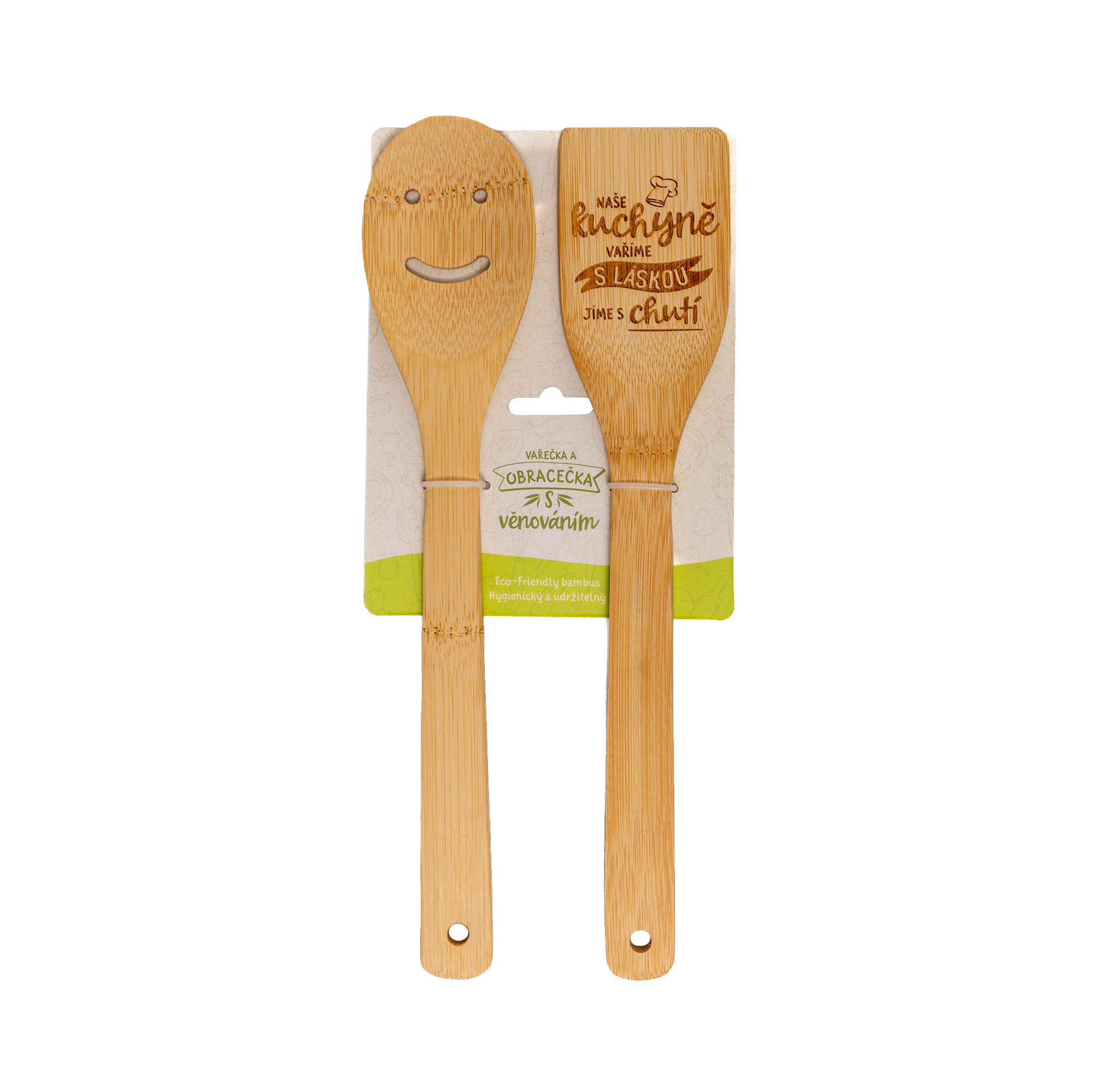 Udělejte radost nejen přírodě, ale také svým blízkým s milým a praktickým dárkem. Sada vařeček s věnováním je eko-friendly a udržitelné kuchyňské náčiní z bambusového dřeva. V sadě naleznete vařečku s roztomilým smajlíkem a obracečku s věnováním.  Rozměry balení: 13 cm × 30 cm